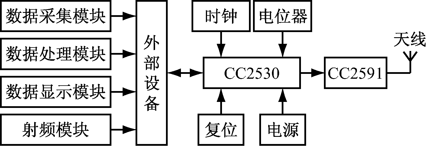 (2) 数据处理模块。为了满足低功耗要求,传感器节点采用低成本、低功耗SOC芯片——CC2530作为控制核心[2]。在接收模式和发送模式下,CC2530的电流损耗分别为24 mA和29 mA,在睡眠模式下,CC2530消耗的电流仅为1 μA;利用有效位数多达12位的ADC实现对采样数据的模数转换,并用DMA将转换结果写入存储器,从而实现数据处理功能。