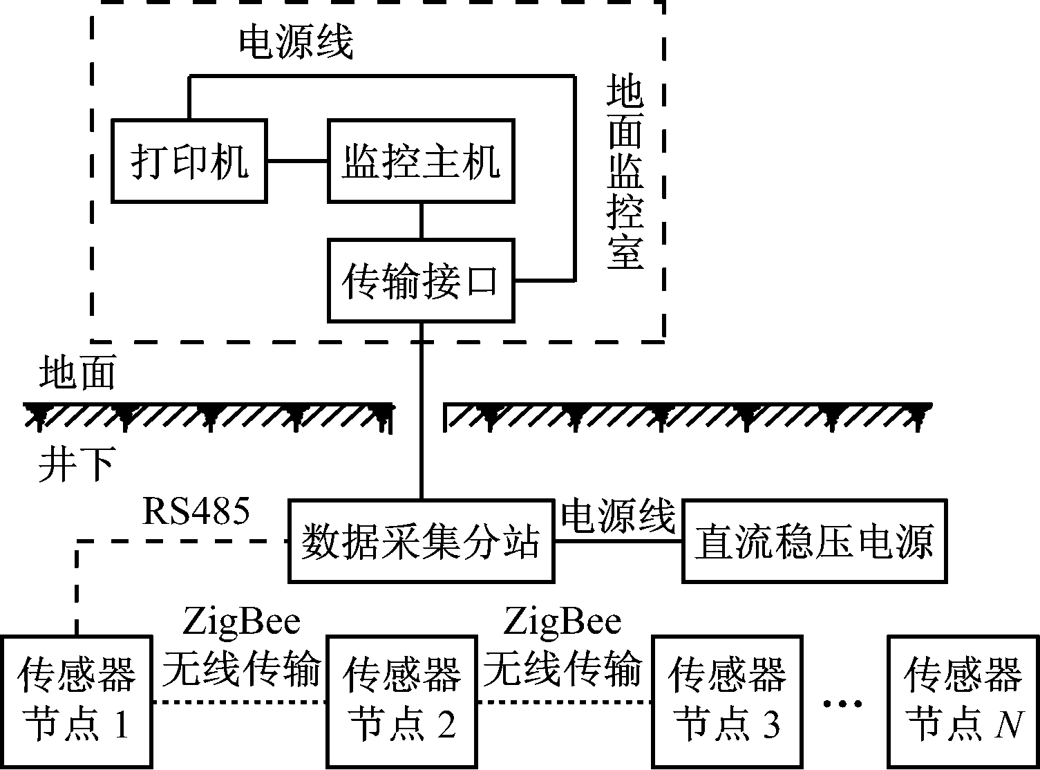 矿压传感器采集各种压力后,依次将压力数据通过ZigBee的方式传送到数据采集分站,数据采集分站将汇总的所有压力数据通过RS485总线传输到监控主机中。井下通信采用ZigBee无线传输方式,降低了各个传感器节点的功耗和组网复杂度,大大提高了传感器电池的使用寿命。同时也确保了数据的可靠安全传输,节约了成本。
