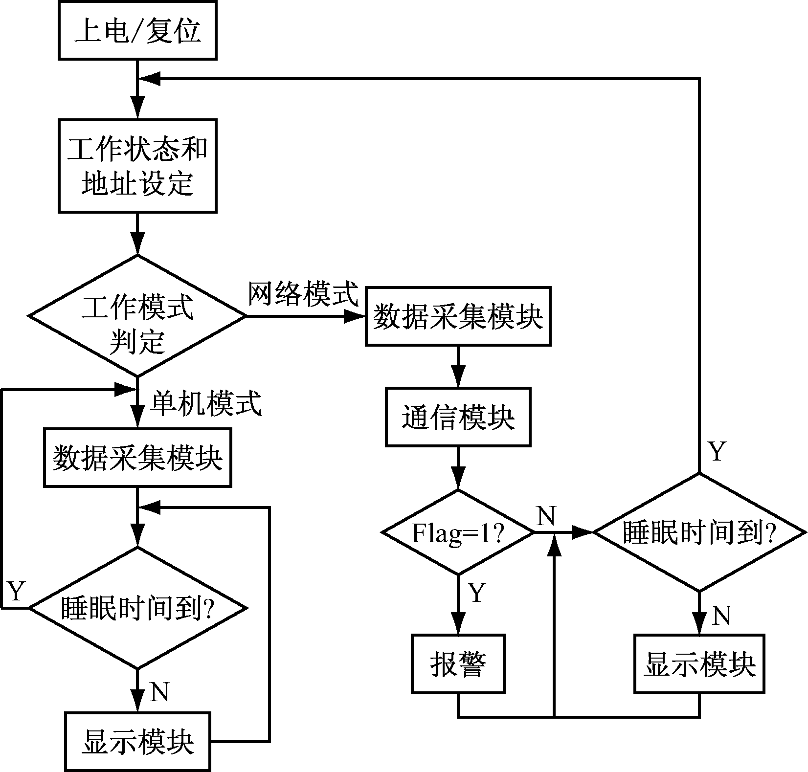 数据的无线发送与接收是功耗最大的部分,为了降低这部分的功耗,要考虑到节点因为故障不能收发数据的情况,将不能通信的节点转到单机模式,只采集而不发送数据,其他节点跳过该节点进行通信,节点工作流程如图5所示。