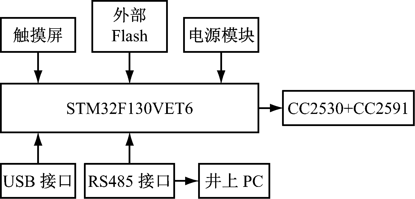 (3) 射频模块。系统采用ZigBee的方式进行数据传输[3],通信频率为2.4 GHz,为了适应井下复杂的工作环境,保证长距离的通信以及较低的误码率,射频模块选用CC2530芯片,同时辅以低成本、高性能的射频前端模块CC2591,实现传感器节点间的无线通信,进而组成无线传感网络。