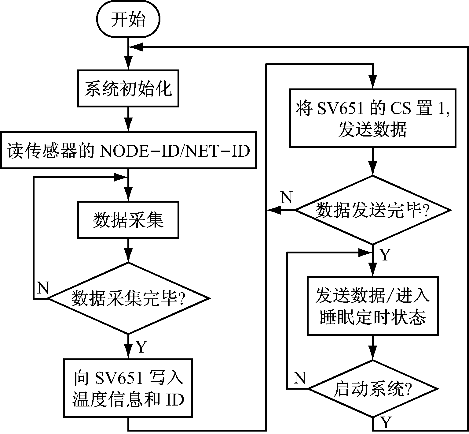 经STM32处理后的数据通过串口发送给无线发射/接收模块,然后发送给分站。首先STM32把SV651的片选端CS置0,SET置0,使SV651进入待机状态,然后把温度传感器的NODE-ID/NET-ID通过串口写入SV651中。STM32再次把CS置1,使SV651进入发送状态,启动数据发送;SV651将CRC校验码打包后,将数据发送给分站,数据发送完毕后,传感器模块进入定时睡眠状态,等待被唤醒。传感器模块工作流程如图6所示。