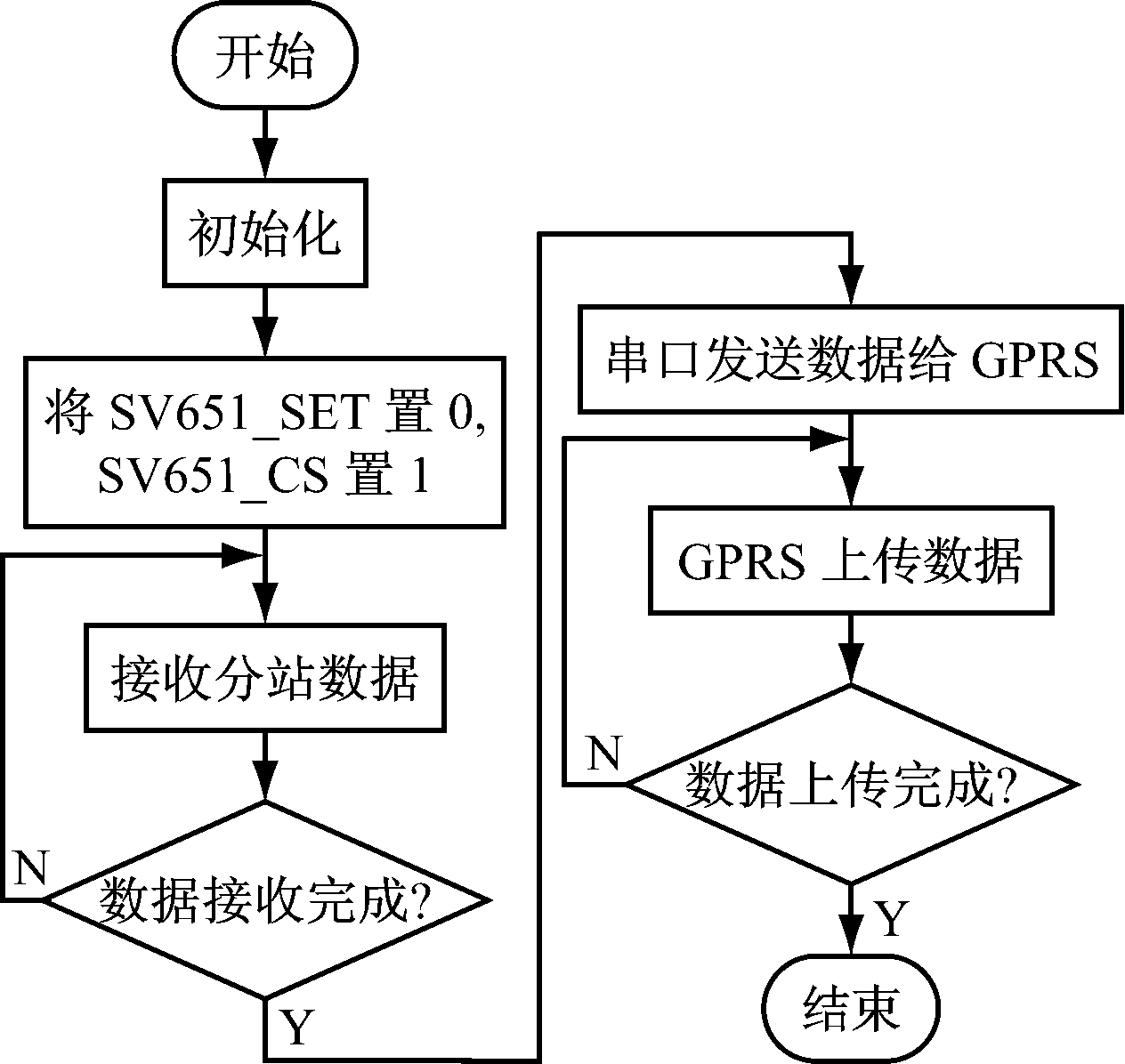 分站的无线发射/接收模块接收传感器发送来的数据,并通过串口发送给STM32。STM32把SV651的SET置0,CS置1,使SV651处于接收数据状态;数据包接收完毕后,进行CRC校验,如果校验正确,则SV651会自动去除CRC校验部分,把数据保存在寄存器内,并通过串口发送给STM32。分站STM32的作用是简单的数据中转和控制。