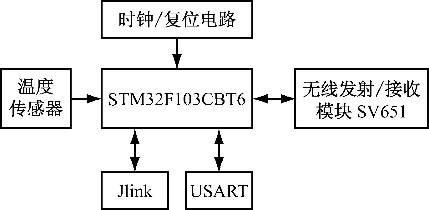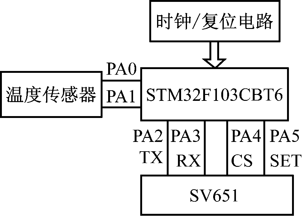 传感器模块主要由温度传感器、STM32处理器、无线发射/接收模块SV651组成。温度传感器的主要作用是采集煤炭储存场所各个点的温度变化。传感器主控电路由STM32及其最小系统组成,是传感器模块的核心,主要完成信息处理和传送。温度传感器采集的是模拟信号,经过STM32处理器内置的ADC进行AD转换,然后由STM32处理器进行处理,得到煤炭储存场所各个点的温度实时数据。处理器通过无线发射/接收模块SV651向附近的分站发送采集到的实时温度。传感器模块硬件结构如图2所示。