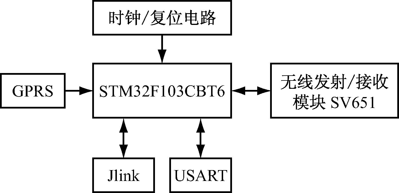 分站模块主要包括无线发射/接收模块SV651、STM32处理器、GPRS模块。其中无线发射/接收模块SV651用来接收传感器模块发送来的实时温度数据,然后传送给分站的主控制器STM32处理器。分站处理器接收数据后,进行编号处理,并将处理后的数据发送给GPRS模块,经GPRS模块发送给控制中心。控制中心读取煤炭场所各个点的温度,并采取必要的预防措施。在上位机软件中可设置报警上限,当煤炭储存场所某点温度达到上限时,发出报警,提醒值班人员采取必要措施。分站模块硬件结构如图3所示。