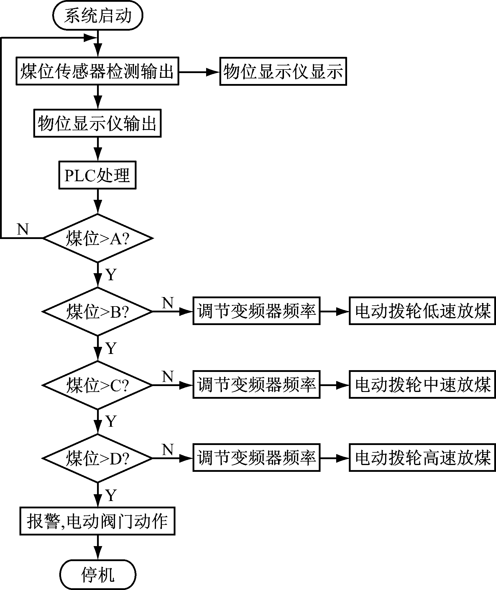 系统采用自动控制方式时工作流程如图5所示。煤位传感器探头检测入料斗中块煤的堆积高度,并将煤位信号传输给物位显示仪,物位显示仪显示煤位高度并将信号输出给PLC。PLC根据煤位信号,通过控制变频器来改变电动拨轮转速,使块煤的落差保持在设定范围内。当煤位到达D时,PLC控制报警装置发出警报,同时控制电动阀门开启。