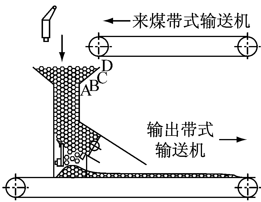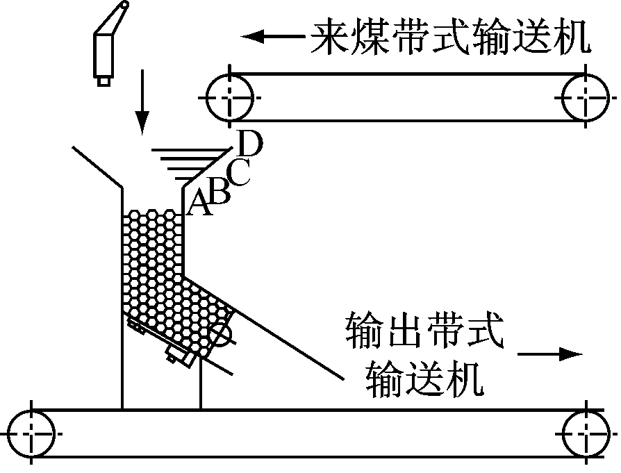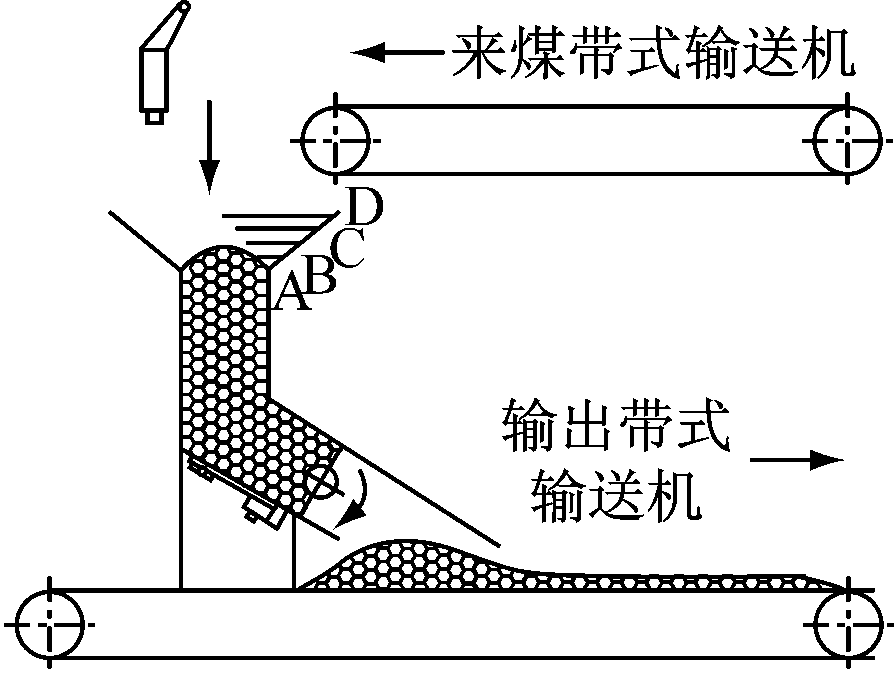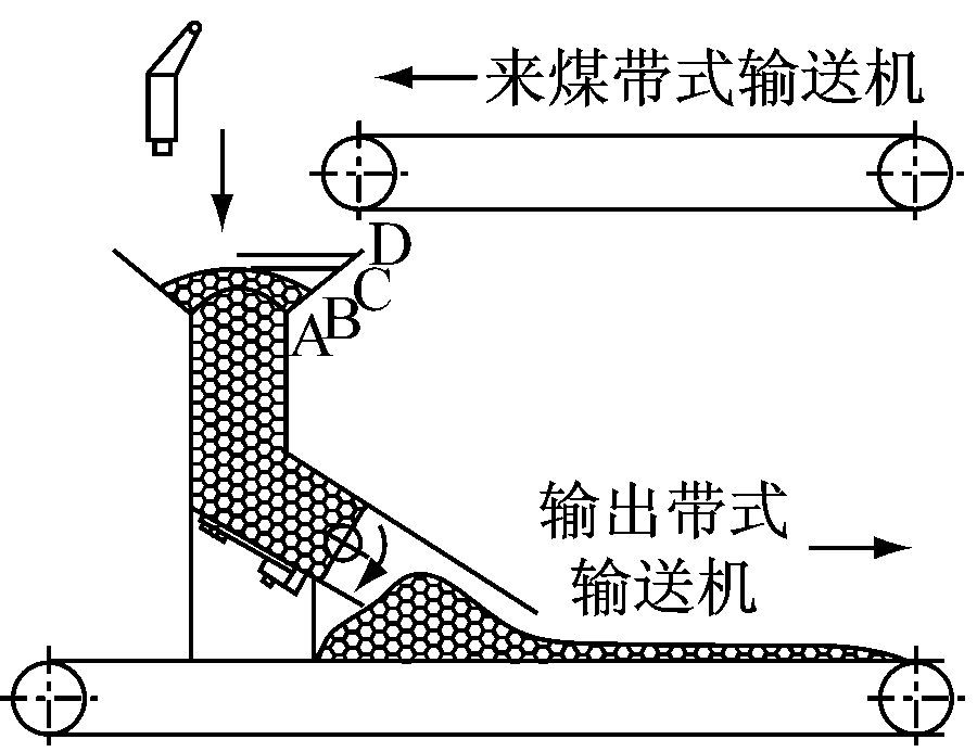块煤转载防破碎系统工作原理如图2所示。在系统工作初期,电动拨轮静止,溜槽处于截止状态,来煤带式输送机输送的块煤在溜槽内堆积,煤位不断升高,如图2(a)所示。当煤位传感器检测到入料斗内块煤的堆积高度达到预设煤位A时,启动电动拨轮以低转速转动输出块煤,如图2(b)所示。如果来煤量少于拨轮输出量,入料斗内的煤位会缓慢降低,当低于煤位A时,通过PLC控制电动拨轮自动停止;如果来煤量大于拨轮输出量,则煤位将继续升高,当超过B时,通过变频器提高电动拨轮转速,以中转速转动输出块煤,若此时仍不能及时将来煤输出,煤位将继续升至C,通过变频器调节电动拨轮至最高转速,如图2(c)所示。当电动机发生故障,块煤无法输出而堵塞溜槽时,块煤堆积高度将继续升高至D,如图2(d)所示。为了避免发生事故,通过PLC控制报警装置报警并打开电动阀门,使溜槽内的块煤不经过电动拨轮而直接落到输出带式输送机上,待排除故障后再恢复正常工作。