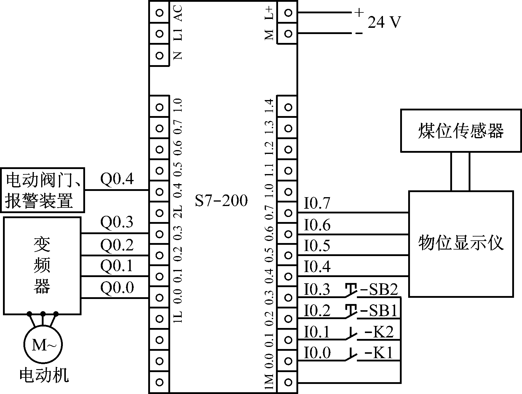 采用S7-200 PLC实现模拟数据处理、开关量逻辑控制及电动机控制。S7-200包括CPU模块、2个输入/输出模块。CPU模块接线如图4所示,其中输入模块连接物位显示仪、接触器、按钮开关和24 V直流电源;输出模块连接变频器、电动阀门、蜂鸣器及报警灯。S7-200 PLC端口地址分配见表1。