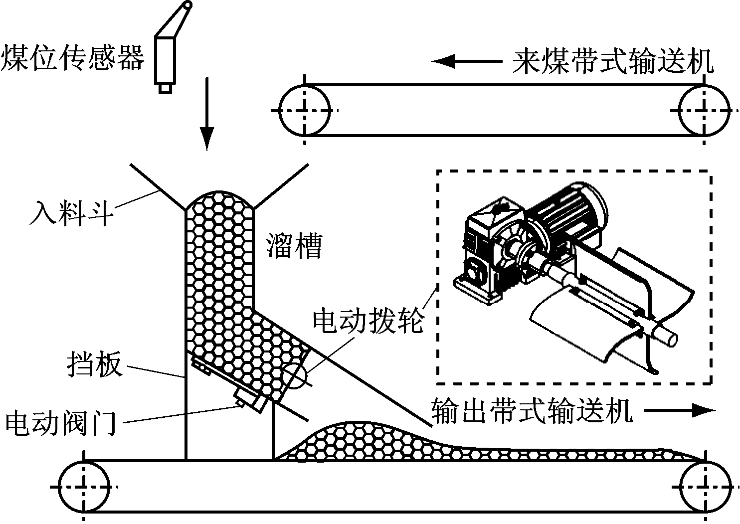 根据式(1),块煤转载防破碎系统采用拨轮式缓冲防破碎方案,如图1所示,使块煤的落差由来煤带式输送机与输出带式输送机之间的垂直距离降低为来煤带式输送机到入料斗间的距离,从而减少块煤的破碎量。系统机械结构主要包括入料斗、溜槽、煤位传感器、电动阀门、电动拨轮等。入料斗采用广口设计,用于承接来煤带式输送机的落煤;溜槽采用分段设计,用于缓冲块煤下落动能;煤位传感器用于实时检测入料斗中煤位高度;电动阀门作为辅助工具,用于输出电动机发生故障时堵塞的块煤;电动拨轮主要由电动机、减速器和拨轮组成,如图1中虚线框内所示,其中电动机选用异步电动机,减速器选用蜗轮蜗杆减速器,拔轮采用与溜槽壁紧密接触的耐磨橡胶板,用于块煤的连续输出。