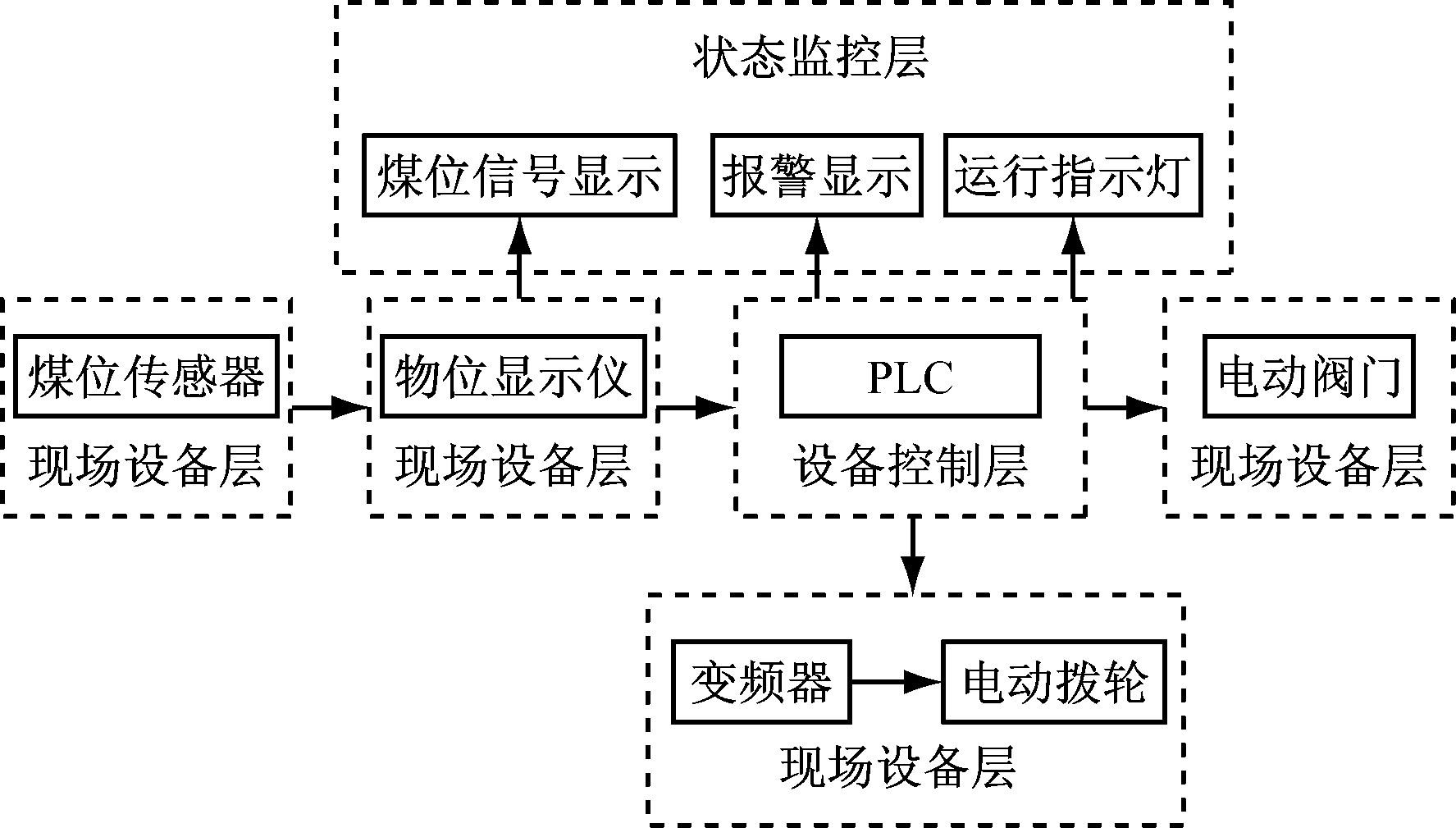 块煤转载防破碎系统的PLC控制系统分为现场设备层、设备控制层和状态监控层,如图3所示。现场设备层主要包括煤位传感器、物位显示仪、变频器、电动拨轮、电动阀门等,其中煤位传感器检测溜槽内的煤位,物位显示仪显示煤位高度,变频器控制电动拨轮转速。设备控制层主要为PLC,实现对现场开关信号与模拟信号的检测和反馈控制。状态监控层用于对各监测信号及块煤转载防破碎系统运行状态进行集中显示。