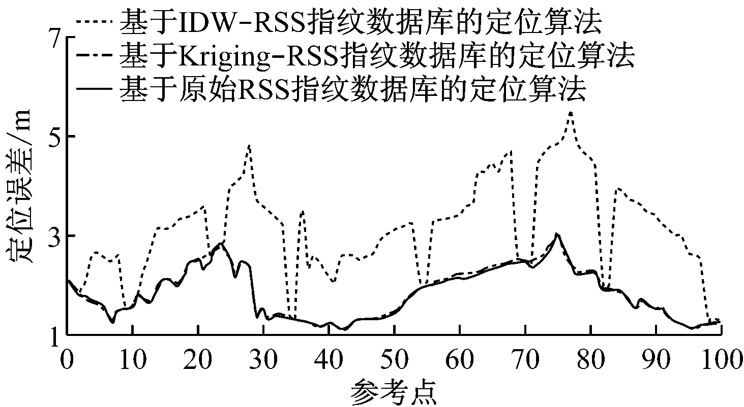 基于不同RSS指纹数据库的定位算法的定位误差实验结果如图2所示。从图2可看出,基于原始RSS指纹数据库的定位算法得到的平均定位误差为2.255 m;基于Kriging-RSS指纹数据库的定位算法得到的误差平方和的均值为0.213,平均定位误差为2.276 m,在每个参考点上的定位误差与基于原始RSS指纹数据库的定位算法得到的定位误差几乎一样;基于IDW-RSS指纹数据库的定位算法得到的误差平方和的均值为1.165,平均定位误差为3.449 m,在每个待估点上的定位误差与基于原始RSS指纹数据库的定位算法得到的定位误差相差较大。这是因为IDW插值算法没有考虑数据之间的空间分布情况,往往会因为观测点的分布不均匀而造成估计结果产生偏差;而本文方法不仅考虑观测点与待估点之间的相对位置,还考虑各观测点之间的相对位置,充分利用了数据之间的空间结构信息。