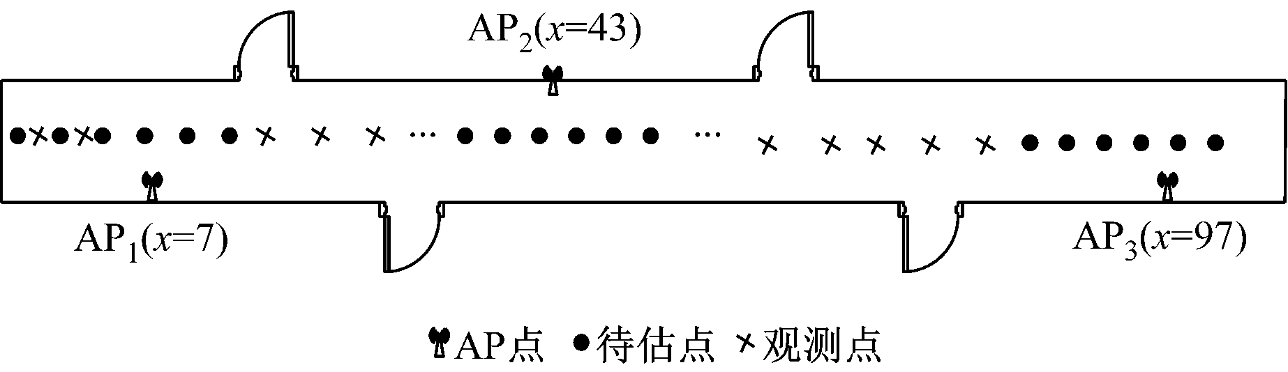 防空洞的地面为水泥地,墙壁较粗糙,顶部两侧布设电缆,从地形结构和电磁波传播特性来看,防空洞与真实矿井环境相似,因此选择防空洞模拟煤矿井下巷道环境。防空洞的长、宽、高分别为150,3.4,4.5 m,以防空洞的长、宽、高为坐标系的x,y,z轴,由于防空洞的宽度和高度远小于长度,所以定位时不考虑目标在y轴和z轴上的变化。防空洞中共布设3个AP(Access Point,接入点),AP1,AP2,AP3的位置坐标用伪坐标表示,分别为(7,y,z),(43,y,z),(97,y,z)。定位区域中共有100个参考点(包括观测点和待估点),参考点之间的距离为1.5 m。定位区域截面如图1所示。
