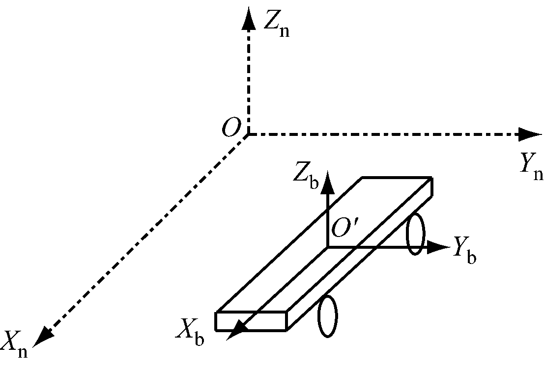 对于采煤机,导航坐标系选取地理坐标系O -XnYnZn,其中Xn,Yn,Zn三轴分别指向东向、北向、天向。载体坐标系O′-XbYbZb原点位于采煤机的质心,Xb轴指向采煤机的前进方向,Yb轴指向采煤机的垂直推进方向,Zb轴指向上,如图1所示。