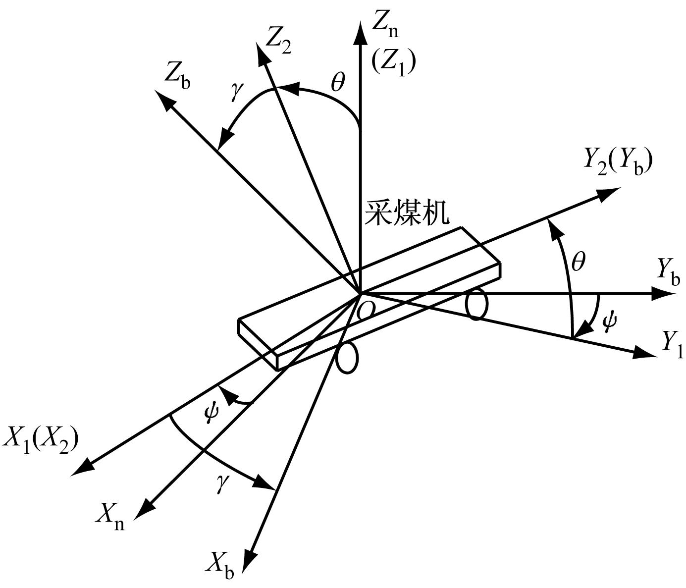 设采煤机的姿态角为航向角ψ、俯仰角θ、横滚角γ。初始时刻,载体坐标系与导航坐标系重合,经3次旋转后,分别绕Z轴旋转ψ,绕X轴旋转γ,绕Y轴旋转θ,如图2所示。