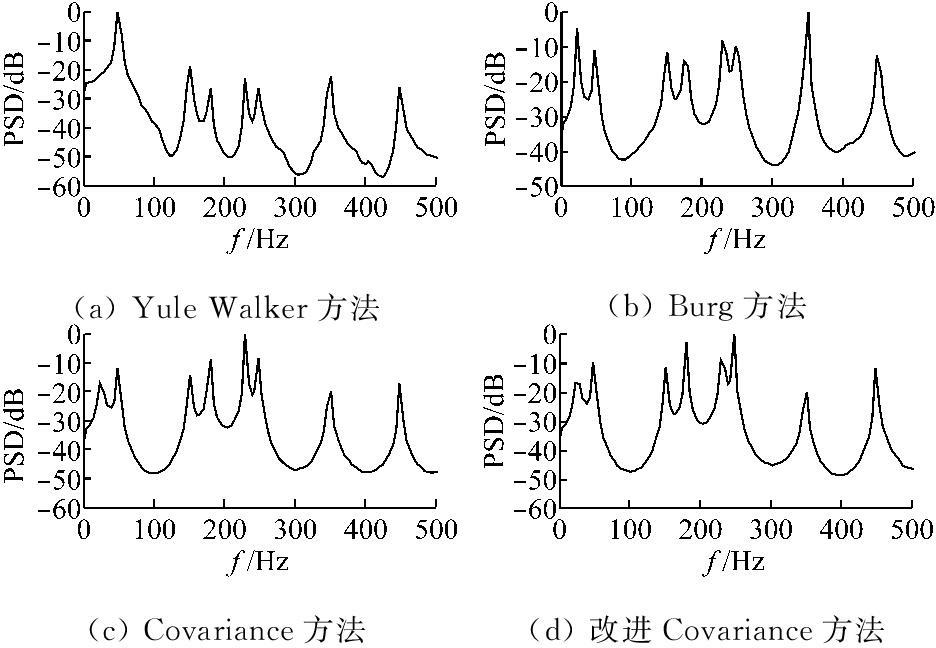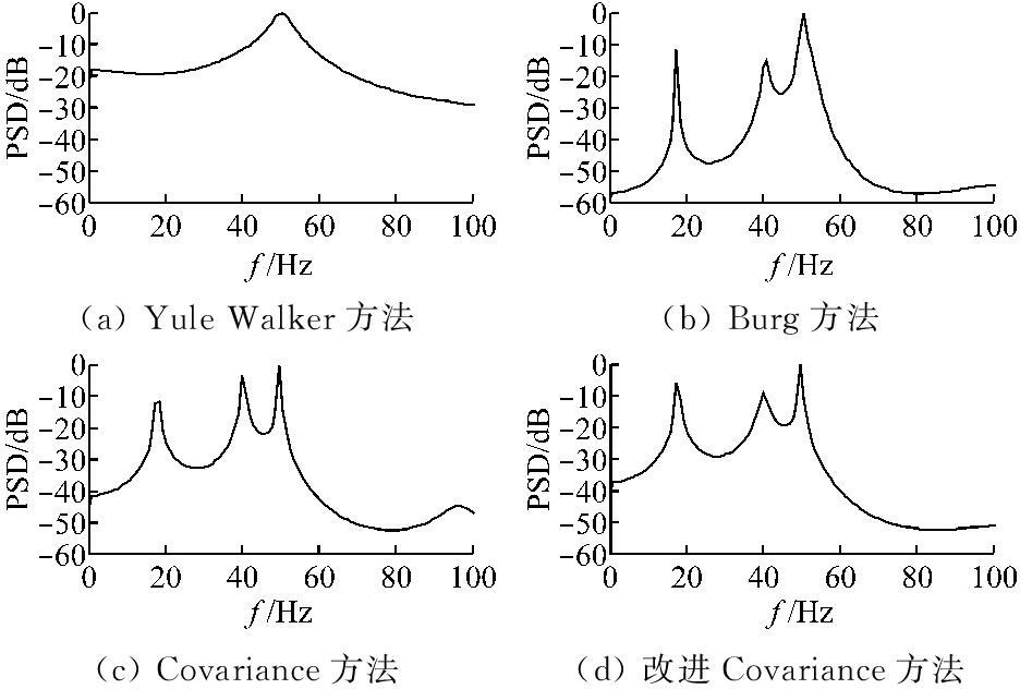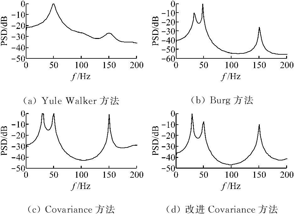 样本A4中包含基波、40 Hz次谐波、18 Hz次谐波。从图5的仿真结果可以看出,Yule Walker方法只能检测出基波成分,不能检测40 Hz次谐波和18 Hz次谐波,Covariance方法在检测中出现了错误,Burg和改进 Covariance方法对谐波样本均能很好检测。