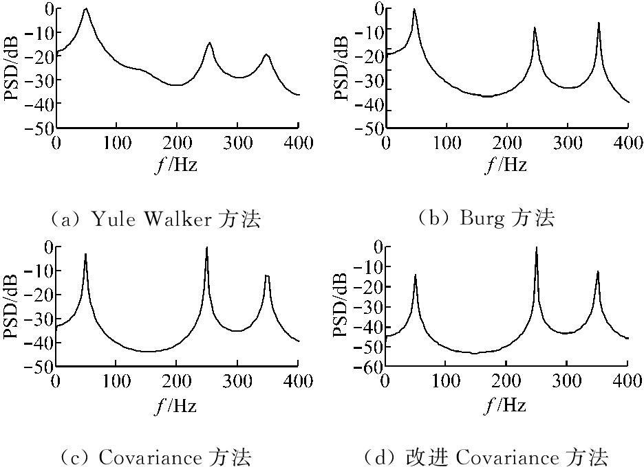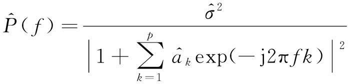 参数谱估计方法的原理是用参数模型来逼近真实,其在信号频谱分析上具有很大优势。AR模型、MA(滑动平均)模型和ARMA(自回归滑动平均)模型[11] 是3种常用的参数模型,其中AR模型不需要对非线性方程求解,只需要对AR参数进行估计,因此,计算过程相对简单。此外,无论是在功率谱分辨率上还是平滑性上,AR模型都表现良好,因而应用广泛。