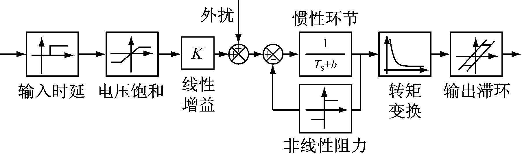 图1中,被控对象的模型被简化为几个非线性环节。在外部信号施加于电动机系统时,输入时延和电压饱和是2个前置非线性模块;经过一阶线性的惯性环节后,系统输出转速信号,在电动机功率恒定的情况下,经过非线性运算(反比)得到输出转矩,而此输出转矩具有滞环非线性特性。由于在被控对象的线性部分存在非线性阻力,所以又构成非线性阻力的反馈环。