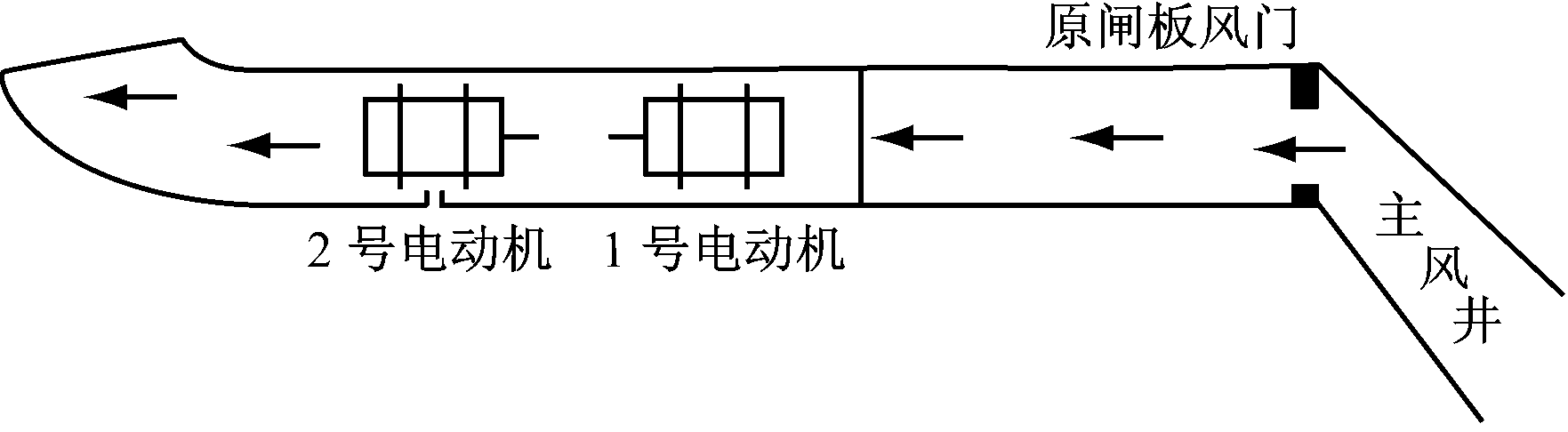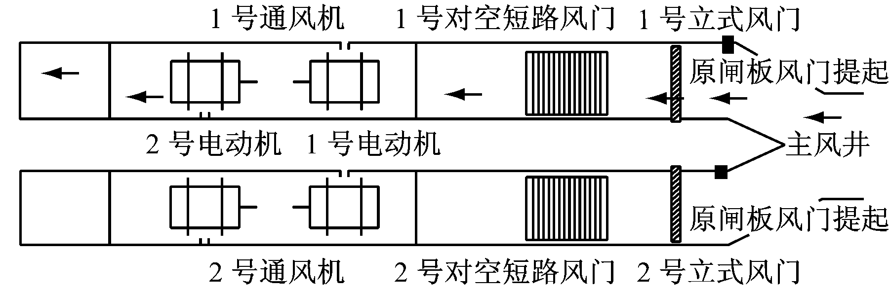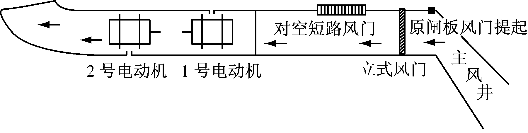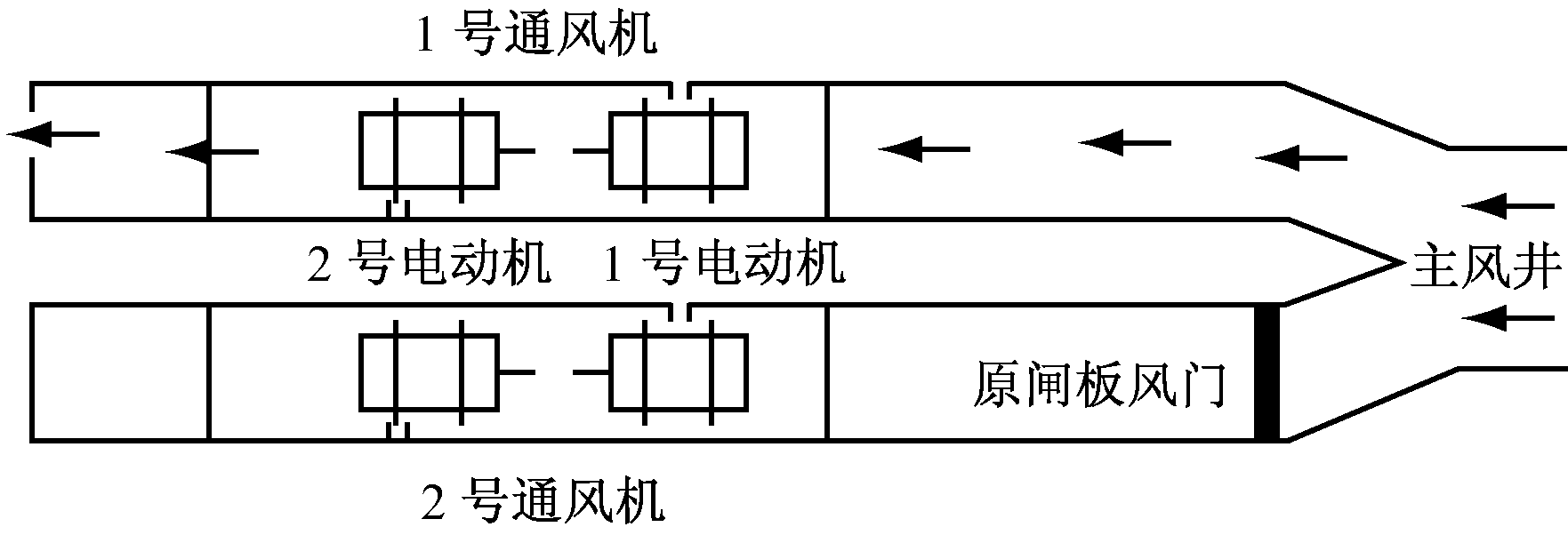 除冷备用方式导致通风机启动和挂网的不确定性外,对于高瓦斯矿井,通风机停机倒机方式还会引起瓦斯积聚,对矿井安全生产造成隐患。笔者提出通风机热备用思路,即在停转原运行通风机之前启动备用通风机,通过通风机由冷备用向热备用过渡来消除通风机启动的不确定性。在备用通风机正常启动后,通过风道上的风门实现风路切换,将传统停机倒机过程中的通风系统停风改为在风门切换风路的较短时间内的风量波动,实现通风机不停风倒机。但现有通风回路无法实现备用通风机倒机前启动,因此必须进行风道改造。图1为改造前的通风回路,设1号通风机处于运行状态,则2号通风机处于备用状态,为备用通风机。根据轴流式通风机的特点,要想正常启动,必须打开风门,否则会造成通风机堵转。而备用通风机的主风门一旦开启,将会形成短路风,使井下无风或微风,此时备用通风机会因风流的作用处于反向旋转状态,不利于启动。