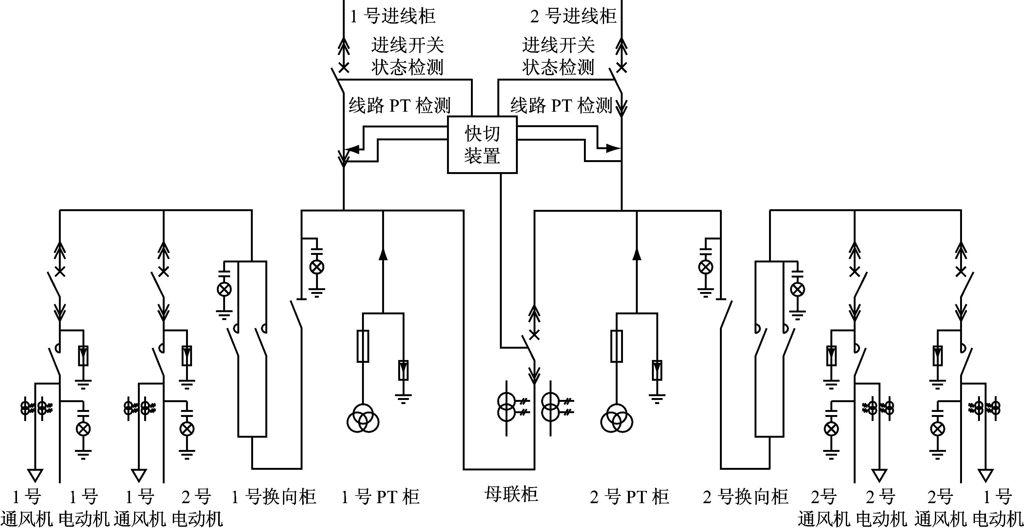 煤矿通风机供电系统常用双回路供电、单母线分段运行方式。为了提高主要通风机供电安全水平,笔者所在的研究团队提出在电源故障情况下,采用高压快切装置快速切换至备用电源。高压快切装置安装在2路进线上,如图4所示,采用母联切换的工作方式。与低压系统常用的备用进线自动投入装置不同,高压快切装置具有逻辑判断和智能选择多种投切方式,以确保投切过程中主要通风机平稳运行,减小启动冲击电流。