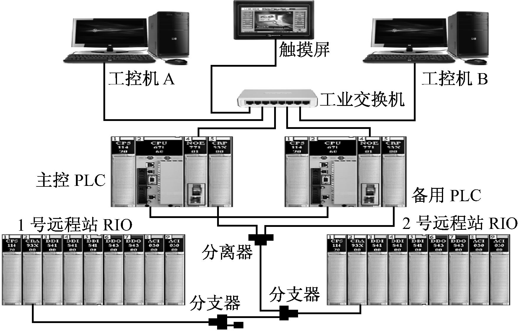 为了提高通风机监控系统的可靠性,笔者所在的研究团队致力于系统冗余设计。从2012年开始,陆续研发了如图5(a)所示的基于昆腾系列PLC硬冗余的通风机监控系统和如图5(b)所示的基于S7-300系列PLC软冗余的通风监控系统。系统中CPU和工控机均采用双机热备形式,正常情况下主机处于工作状态,从机处于监视状态,一旦从机发现主机异常,将会在很短的时间内代替主机。硬冗余系统由硬件实现主从机切换,切换时间为ms级;软冗余系统则通过软件实现,切换时间为s级。