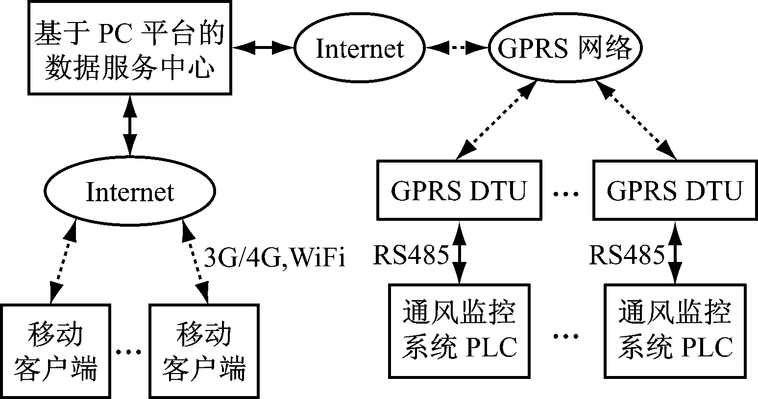 图6为基于移动互联的通风机远程监控系统整体架构。