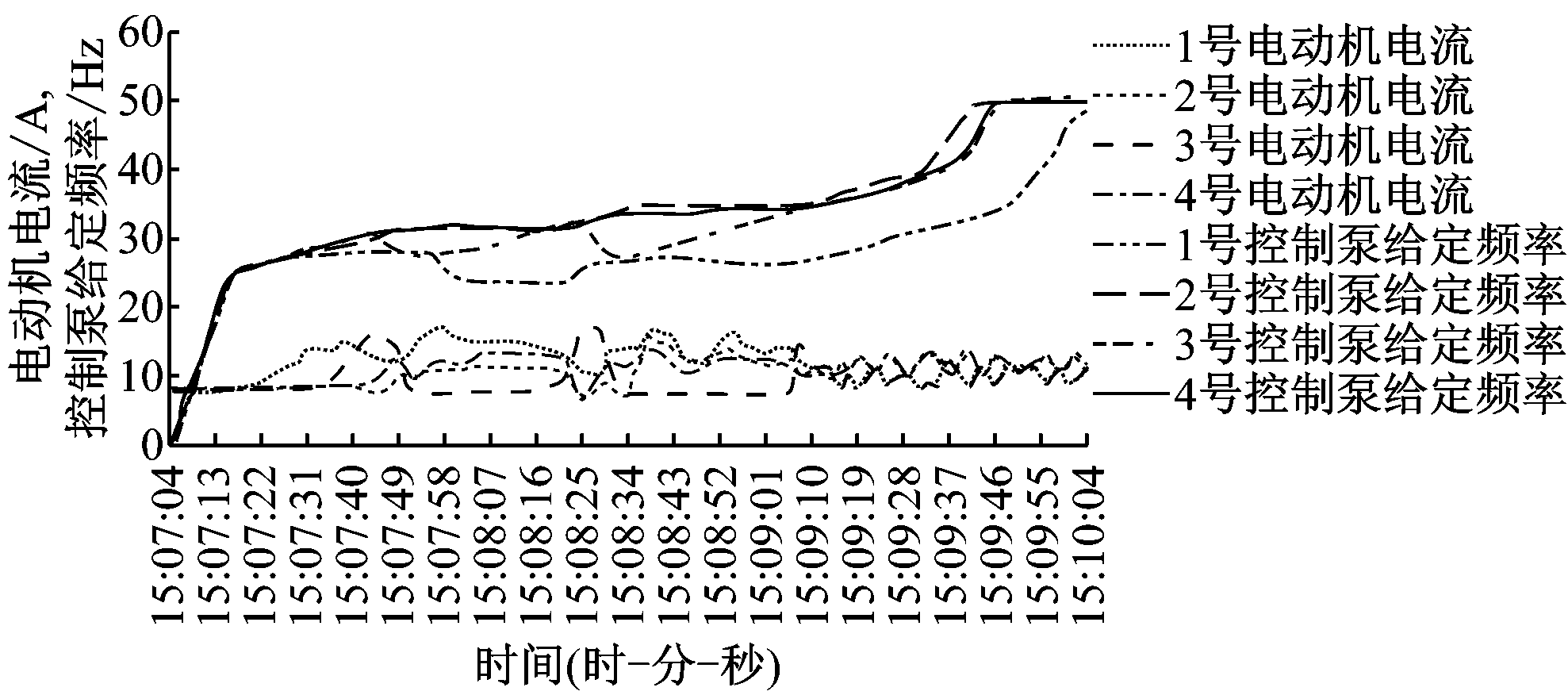 图4 空载启动时4台电动机电流及控制泵给定频率曲线
