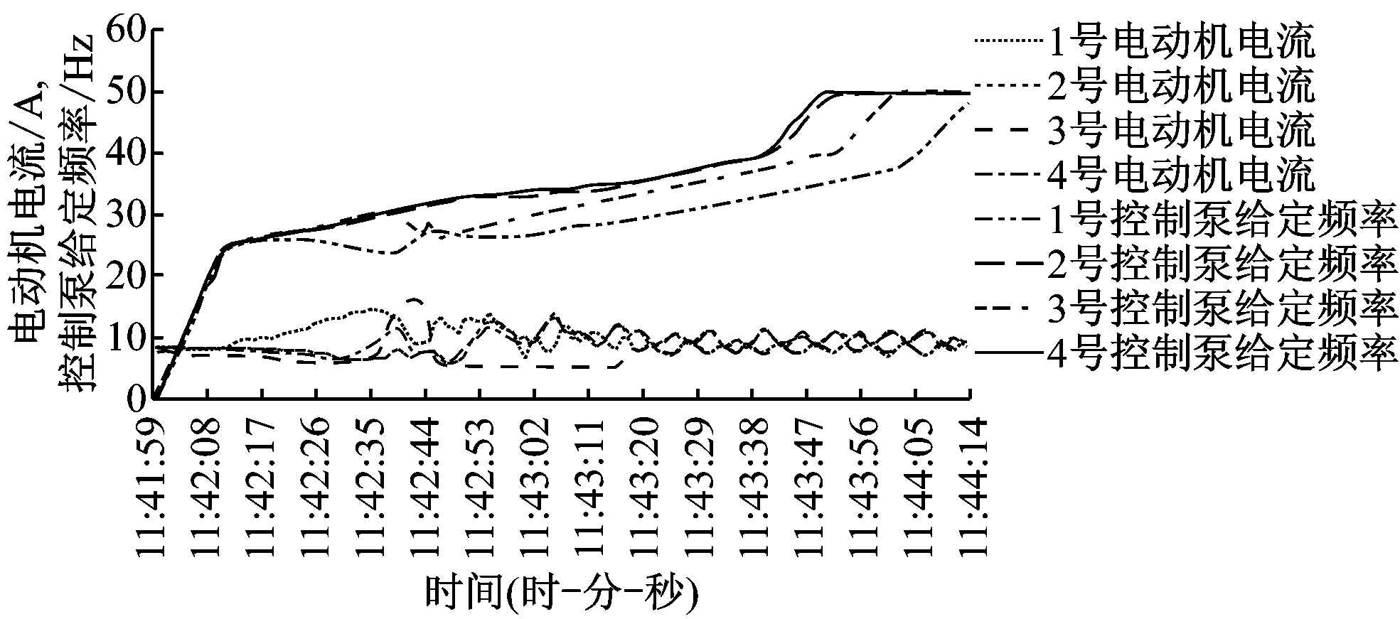 空载和重载启动时4台电动机电流及控制泵给定频率曲线分别如图4、图5所示。从图4可看出,1号电动机电流在启动后快速增大,超出阈值,1号控制泵给定频率减小从而调节1号电动机电流减小;当3号控制泵给定频率增大至31 Hz左右时,3号电动机电流猛增,此时1号电动机电流骤降,3号控制泵给定频率开始减小,3号电动机电流迅速减小;直到3号控制泵给定频率重新上升从而调节3号电动机电流与其他3台电动机电流接近时,4台控制泵给定频率开始同步增加,直至到达工频。从图5可看出,由于重载启动惯性更大,在启动过程中3号电动机电流有2次较大的波动,启动时间也比空载时延长了42 s,但本文控制方法依然起到了有效的调节作用,启动完成时4台电动机电流趋于一致,有效控制了4台电动机在启动过程中的功率平衡。