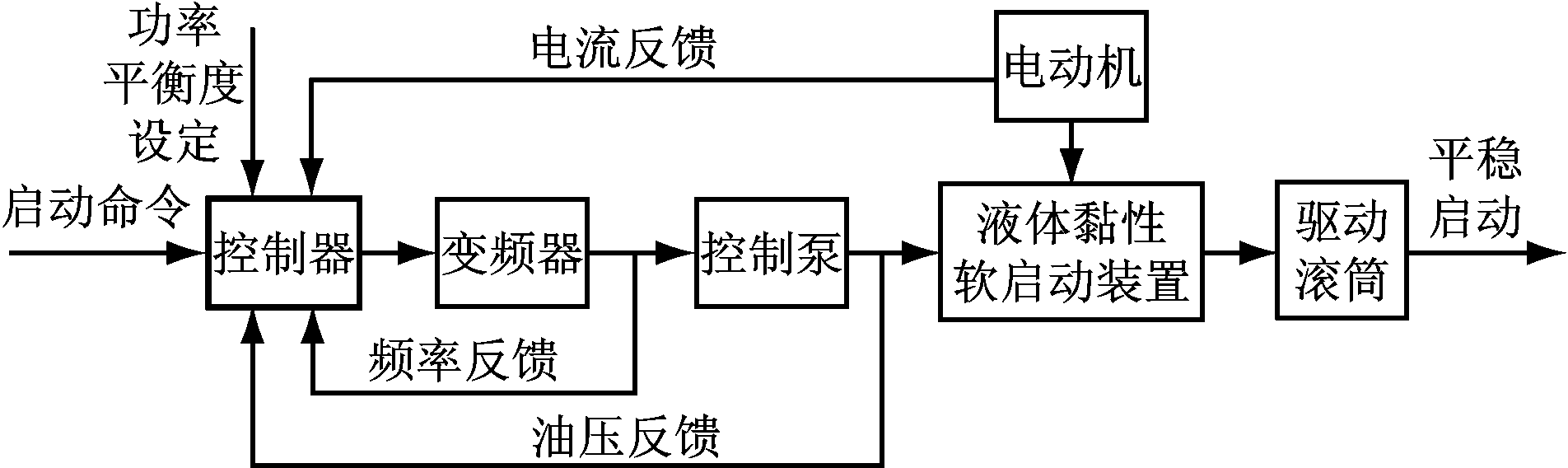功率平衡控制原理如图1所示。控制器接收到上位机发送的启动命令后,输出模拟量信号作为变频器的给定频率输入信号,同时变频器将其输出频率反馈至控制器。变频器驱动控制泵给定频率逐步增加,而控制泵油压与其频率呈正比,因此控制泵油压同步增加,同时将油压信号反馈至控制器。液体黏性软启动装置中主、从动摩擦片之间的油膜厚度与控制泵油压呈反比,随着控制泵油压的增大,油膜厚度减小,液体黏性软启动装置输出转矩变大,电动机输出功率增加,电动机输出转矩通过液体黏性软启动装置传递到驱动滚筒,从而拖动带式输送机启动运行。