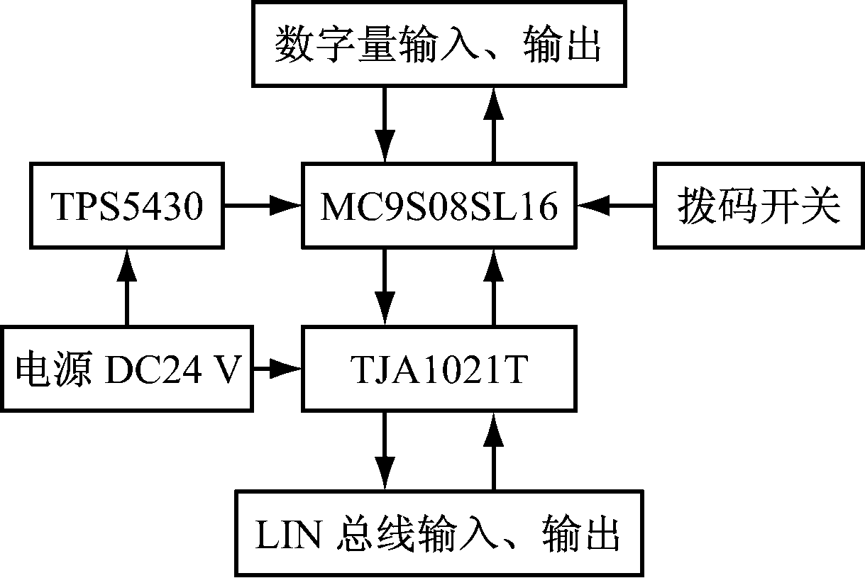 数字量采集模块DI和数字量输出模块DO硬件结构如图2所示,2块模块的原理基本相近,设计采用了微控制器和LIN总线接口芯片结合的方案。微控制器选用MC9S08SL16型高速微处理器,该芯片主要用于CAN总线、LIN总线等通信、LCD驱动、电动机控制等场合。LIN总线接口芯片选用TJA1021T,用以实现控制器和LIN总线间的数据通信,遵从LIN2.1/SAE J2602规范[5]。各模块在应用时必须选择不同地址,可通过拨码开关改变模块地址。