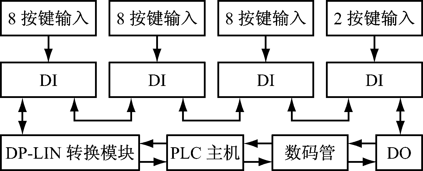 控制键盘的内部结构如图1所示,包括了基于LIN总线的4块数字量采集模块DI、1块数字量输出模块DO、DP-LIN转换模块和可编程数码管[4]。键盘共设有26个按键,控制实现采煤机主启动、主停止、左牵引、右牵引、升降、暂停等功能。每个DI模块最多可采集8路按键控制信息,控制信息经DP-LIN转换模块转换为DP总线信号,直接与PLC主机进行数据交换,并由PLC主机发出通用指令控制采煤机。反过来PLC主机反馈回来的采煤机信息经DP-LIN转换模块转换为LIN总线信号后,通过DO模块输出到可编程数码管显示。