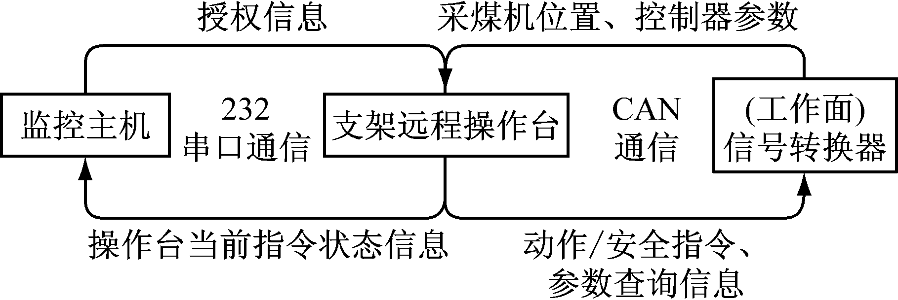 信息数据采集功能包括支架上各传感器检测反馈和云台摄像仪的视频采集。传感器反馈值主要用于控制器对支架的反馈控制;而云台摄像仪的视频信息则传输至工作面巷道监控中心,配合支架远程操作台完成工作面巷道的监控一体化。