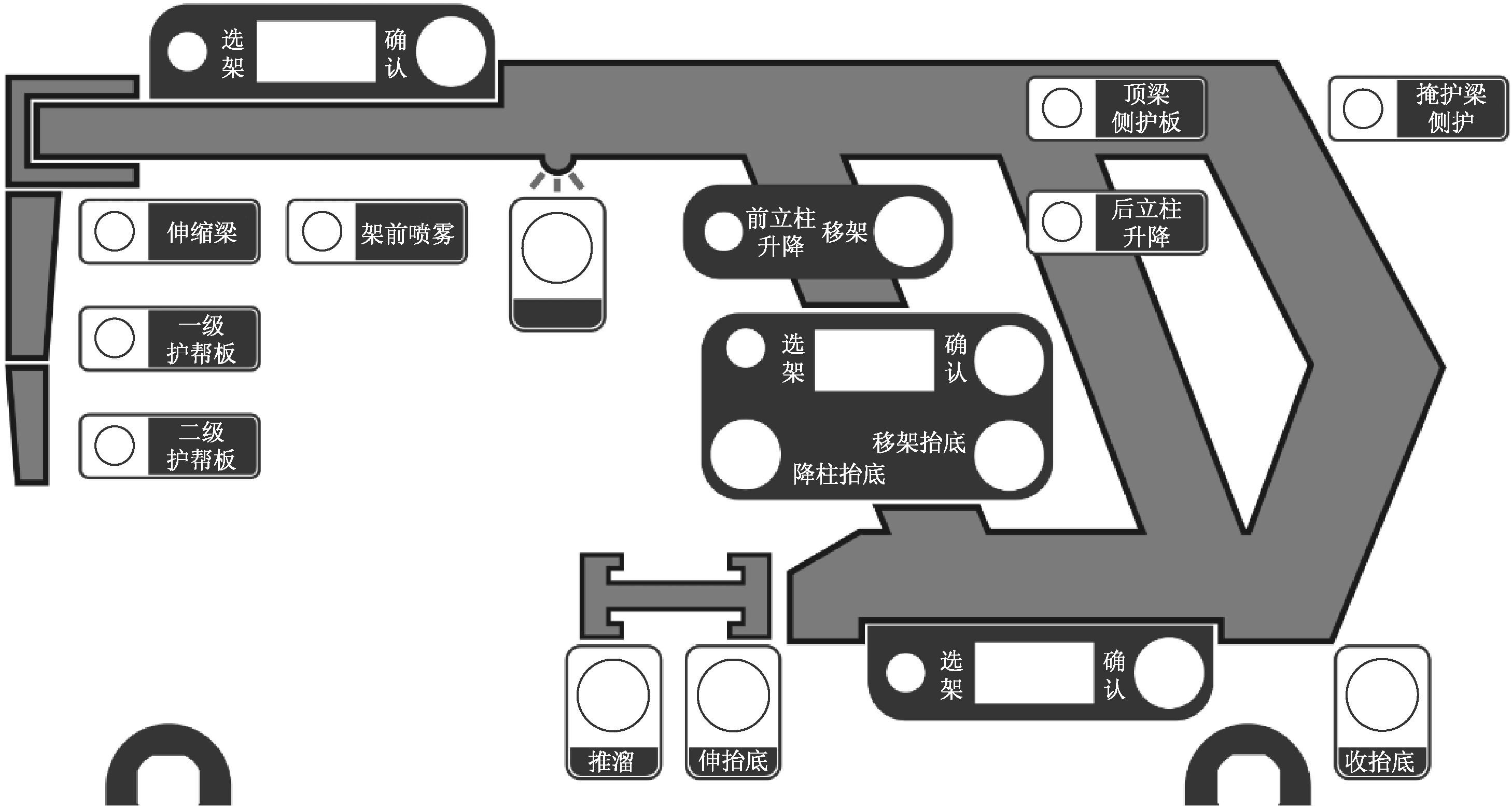目前我国煤矿安全形势依旧严峻,综采工作面事故高发。在环境危险、恶劣的综采工作面实现少人或无人开采,直接减少采煤工作面的人员数量是减少人员伤亡、保障安全的重要手段[1]。由发生事故后被动的人员救险转变为主动减少井下工人数量已在业内形成了共识,即无人则安。近年来,在实现综采无人化方面取得了一些突破,取得了一批综采自动化和智能化技术创新成果,一些矿井实现了综采工作面少人化[2-5]。要达到少人或无人开采,将人员从工作面解放到工作面巷道监控中心或地面,就需要综采系统具备远程操控功能。本文设计了具有独立控制核心、可与工作面和监控中心实时通信的支架远程操作台,实现了工作面巷道监控中心成套装备“一键启停”,提升了综采自动化系统安全可靠程度。远程操控实现了综采系统取代井下工人的目标,从根本上保障了煤炭开采的安全、绿色和高效。