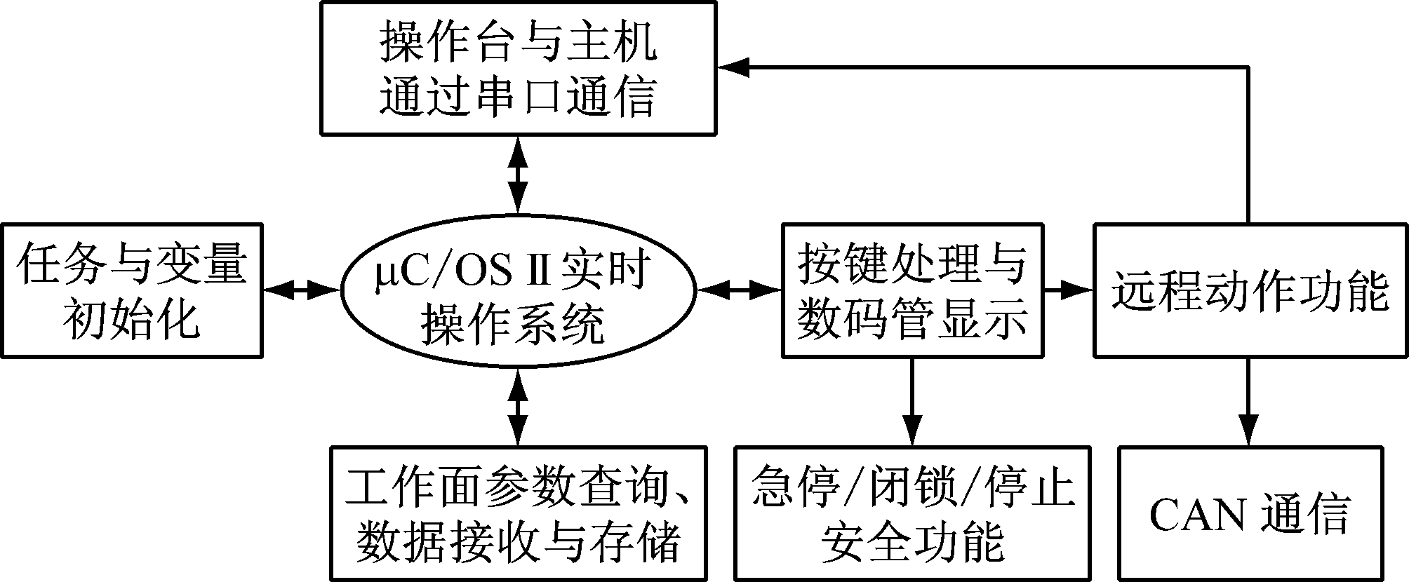 综采自动化系统支架远程操作台在以ARM7为核心的控制模块上,通过μC/OSⅡ嵌入式实时操作系统完成软件功能。根据实时操作系统抢占式的特点,通过对各个任务优先级合理排序,操作台软件可稳定高效地实现所有功能。支架远程操作台软件设计依功能可分为按键处理及显示、安全保护和操作台通信3个部分,软件架构如图2所示。
