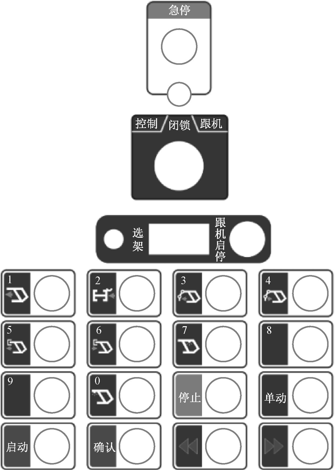 第2区域为预留备用功能和视频切换功能按键,按键触发后操作台将相关命令通过串口转发给主机,实现对工作面综采情况的监视。第4区域为功能启停及成组动作与数字选择复用按键,如图4所示。
