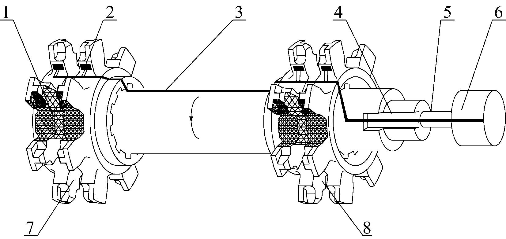 刮板输送机链轮链窝位置变形最大,应变传感器布线安装如图3所示,阴影部分为受力区域。若干组应变传感器贴于相同相位的链轮轮齿根部,可随链轮组件同步旋转,防止应变传感器受损且便于应变传感器贴片。以一组应变传感器布线为例,应变传感器线缆从链轮轮齿间横链槽的中部引出,并在链轮轴上通过轴向凹槽导引,最终连接到链轮轴轴端的固定仓体内部的数据采集仪上,断链检测所需的信号分析装置、无线传输装置和供电装置等安装于固定仓体内部,可随主轴同步旋转,克服了整个链轮应变检测系统设备安装引线带来的不便。