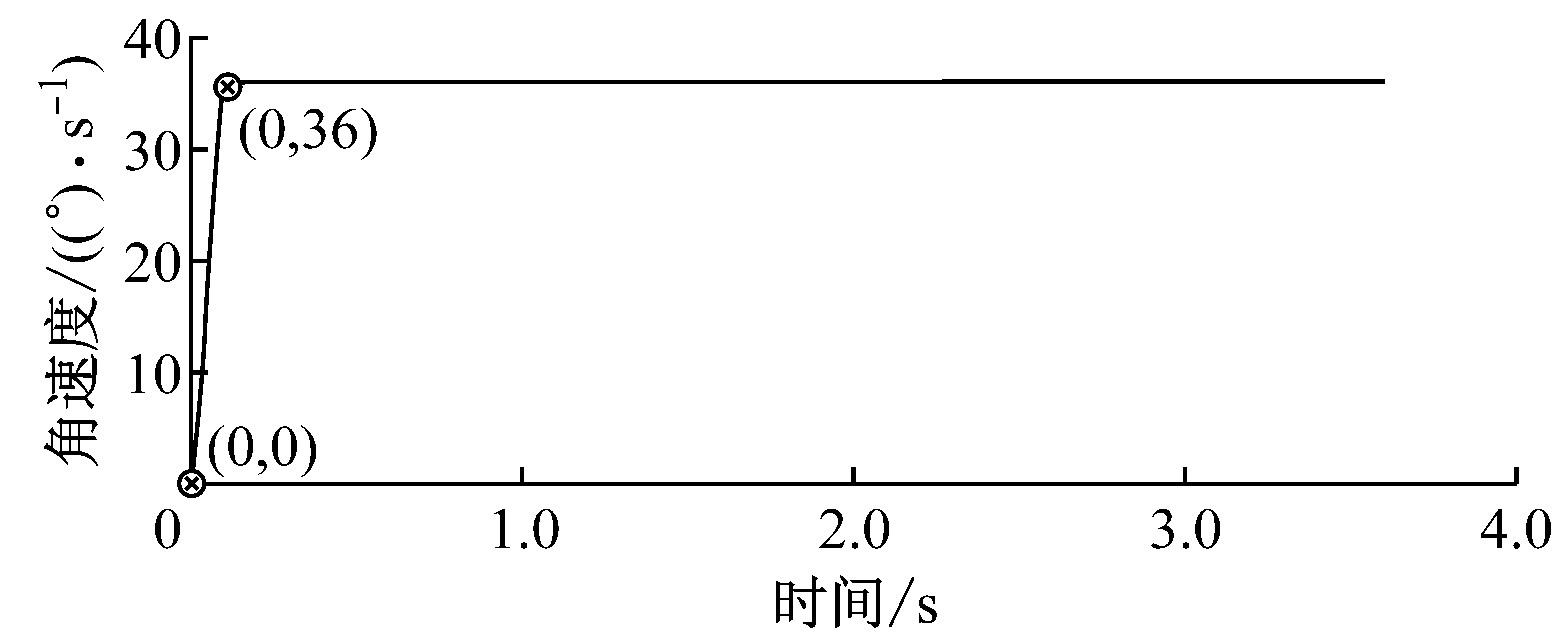 在2个链轮组平面铰接副处施加旋转驱动,采用Step 函数的使用格式为step(time,0,0,0.1,36d),旋转驱动特性曲线如图6所示。