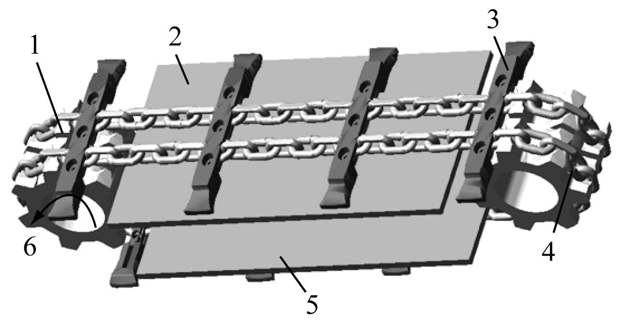 1-链轮组件; 2-上中板; 3-刮板组件; 4-链条(标记平链);