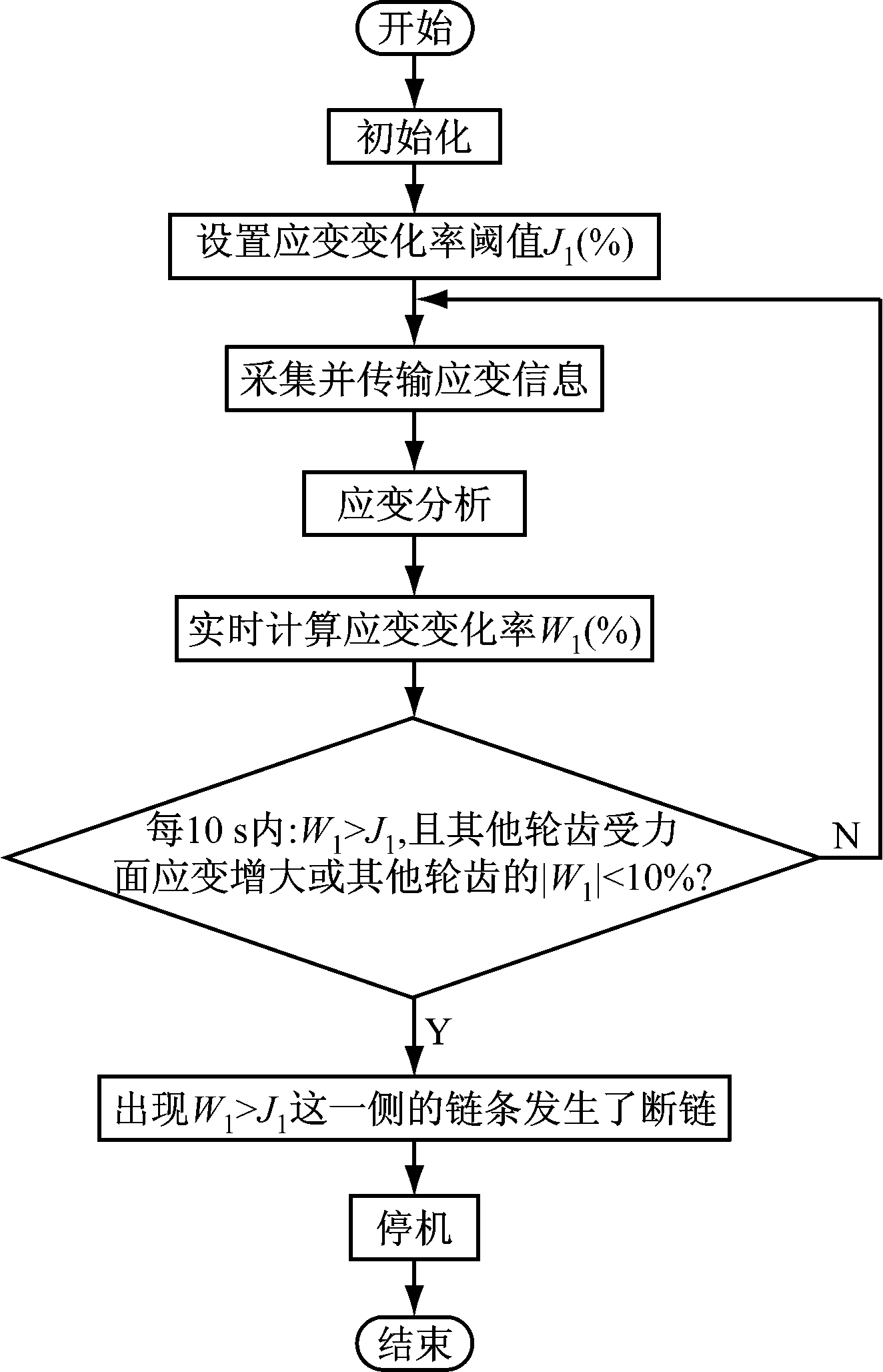 上位机实时比较存储在服务器中的来自信号分析装置的分析结果(与不同链条啮合的链轮轮齿受力面应变变化率W1)与所设定的应变变化率阈值J1之间的关系:若在每10 s内的任意时刻出现W1>J1,且其他轮齿受力面应变增大或其他轮齿的|W1|<10%,则可判定刮板输送机上与应变在10 s内突然减小J1以上的轮齿啮合的刮板链发生了断链。当检测到断链时,上位机立即动作,预警并停机处理,否则上位机不动作,循环执行检测过程。检测系统工程流程如图5所示。