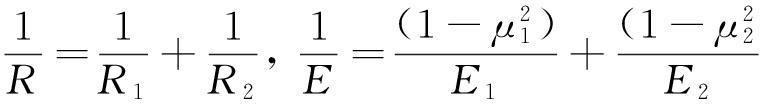 式中:R1,R2为相互碰撞的2个构件的曲率半径;E1,E2为2个构件的材料弹性模量;μ1,μ2为2个构件的材料泊松比。