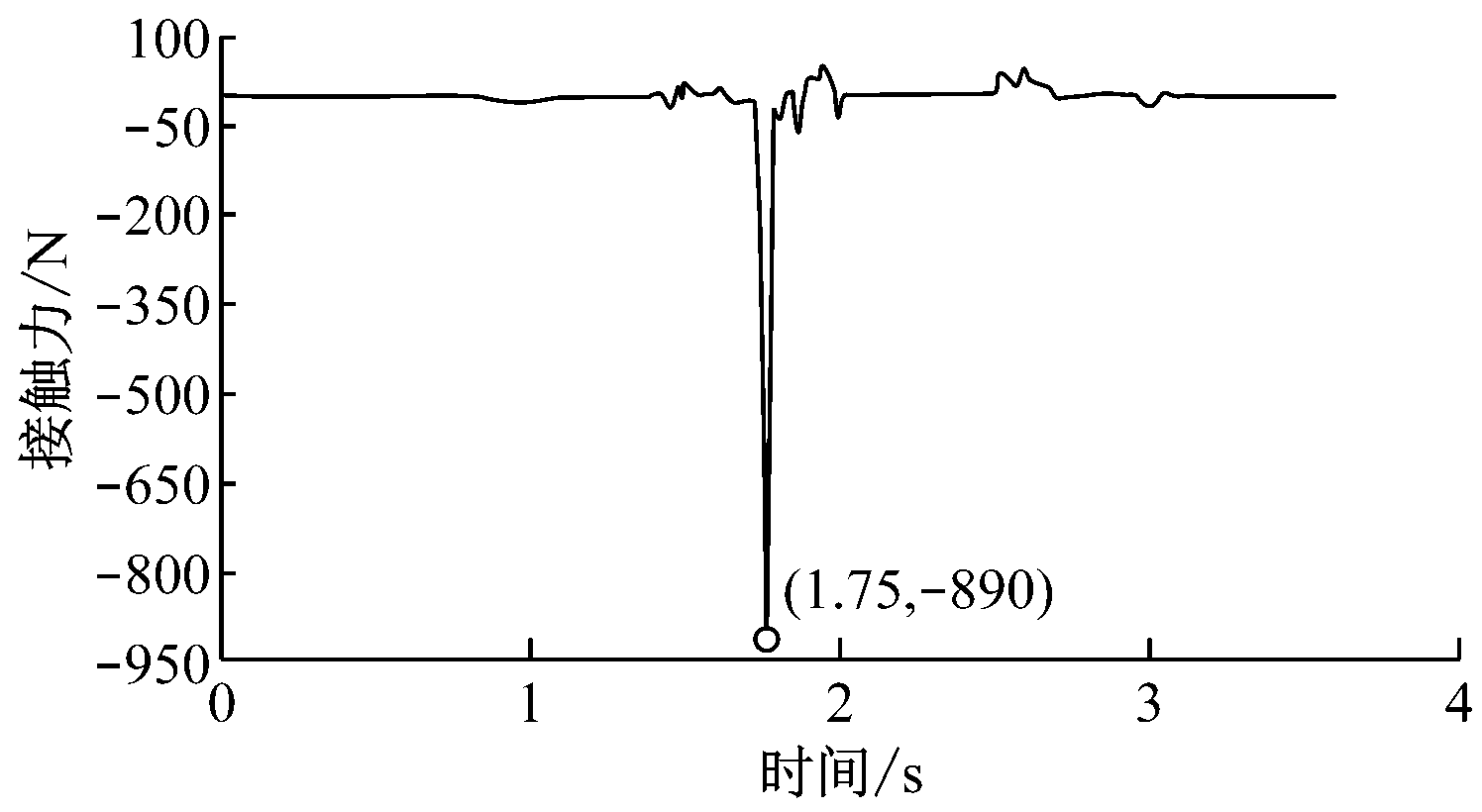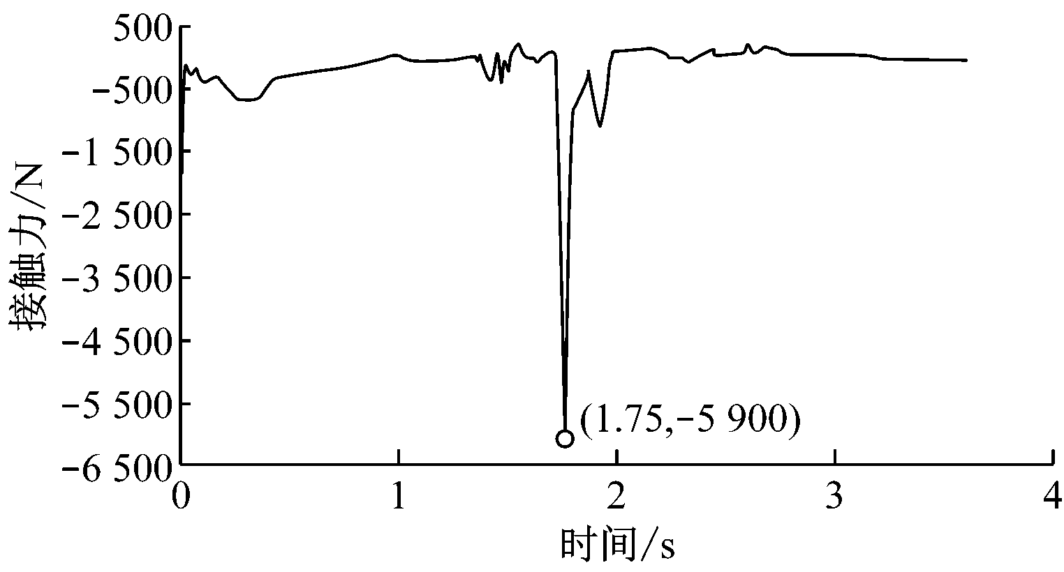 式中:e为相互碰撞的2个构件的碰撞恢复系数;n为接触力的非线性指数(Force Exponent); U为2个接触体碰撞时接触点处的相对速度;δ为2个构件的最大接触穿透深度(Penetration Depth),一般取为0.1 mm。