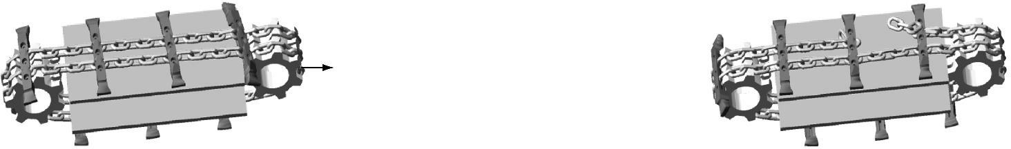 刮板输送机刮板和中部槽模型较为复杂,仿真占用了大量计算机资源,求解困难,通过对链传动系统的三维几何模型添加约束并在虚拟样机模型中圆环链之间以及圆环链与链轮之间定义接触[7],并对驱动链轮和从动链轮定义驱动,实现了整个刮板输送机链传动系统的仿真。通过人为设置故障[8],得到刮板输送机链传动系统从卡链到断链的运行过程,如图8所示。在0~0.1 s内,链轮转速达到30°/s,并以此转速匀速旋转,设置仿真时间为5 s,仿真步数为500歩。