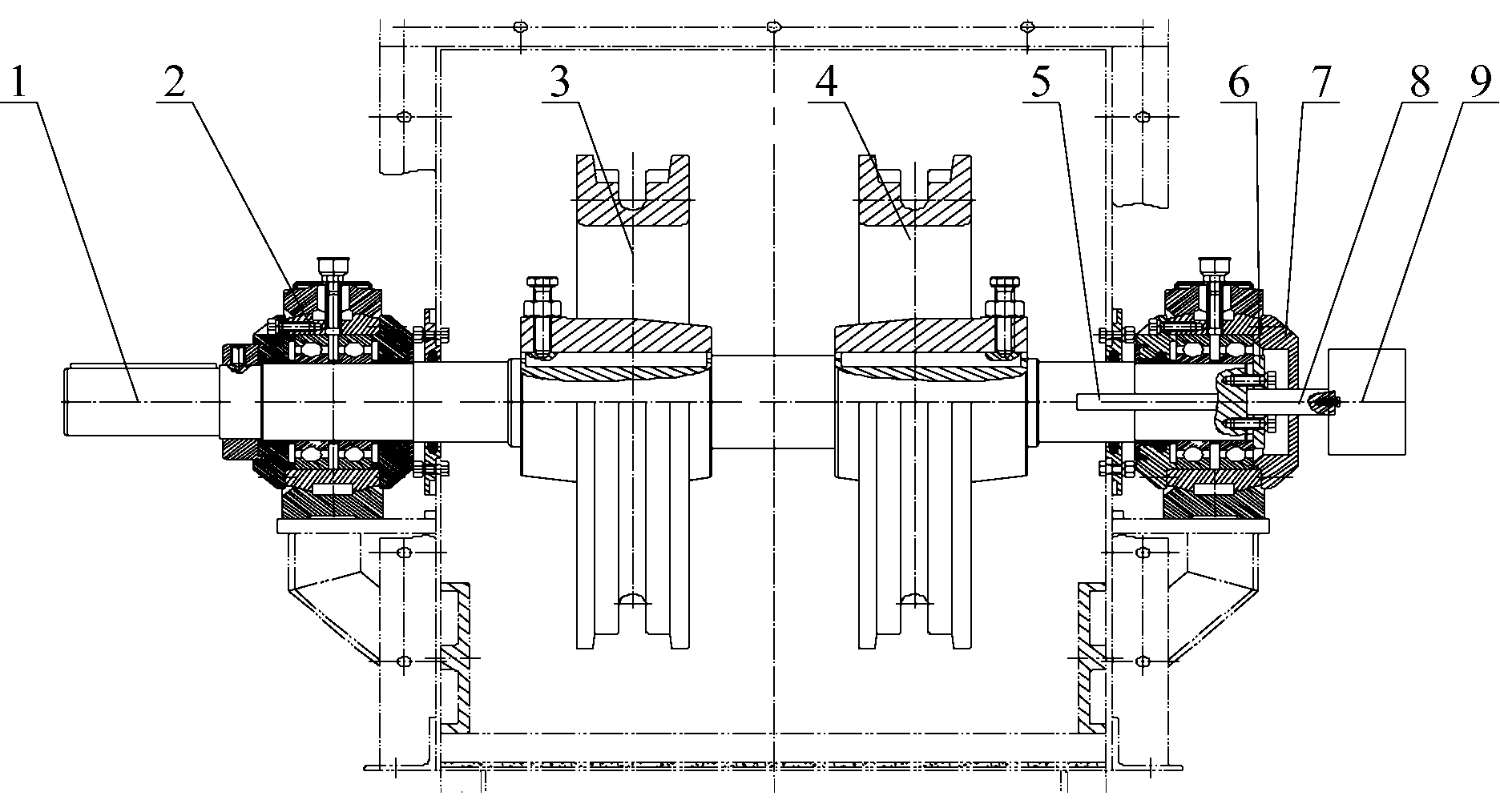 1-主轴; 2-调心轴承; 3,4-驱动链轮; 5-引线槽; 6-挡圈;