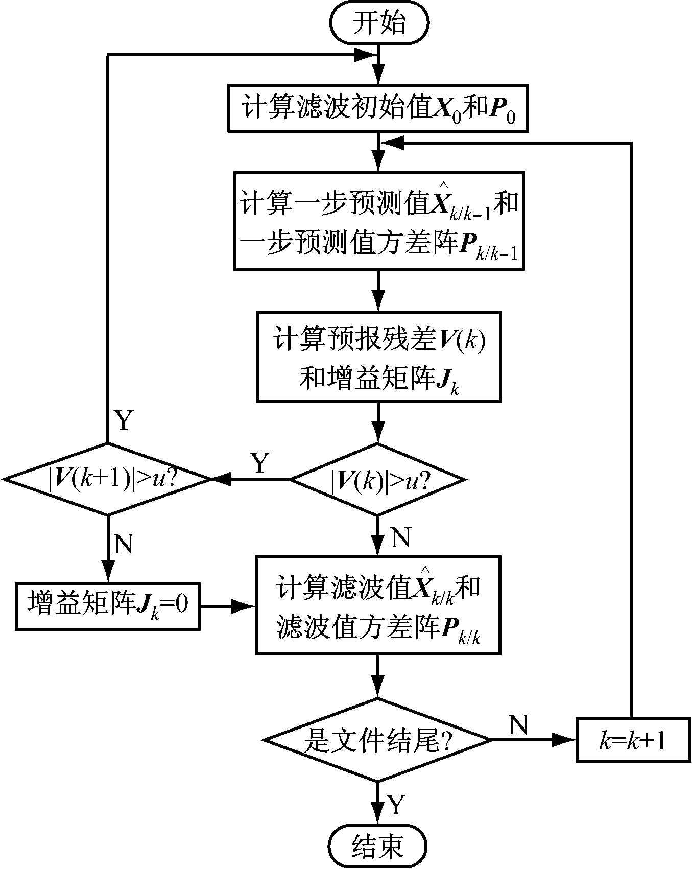 k+1/k-1,并判定 V(k+1)与检验阈值u′=2.5u间的关系,u′=2.5u是因为V(k+1)是第k+1个历元时刻的一步预测误差,在计算过程中第k个历元时刻的观测值并没有参加滤波计算。若