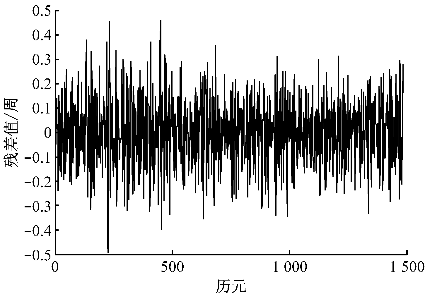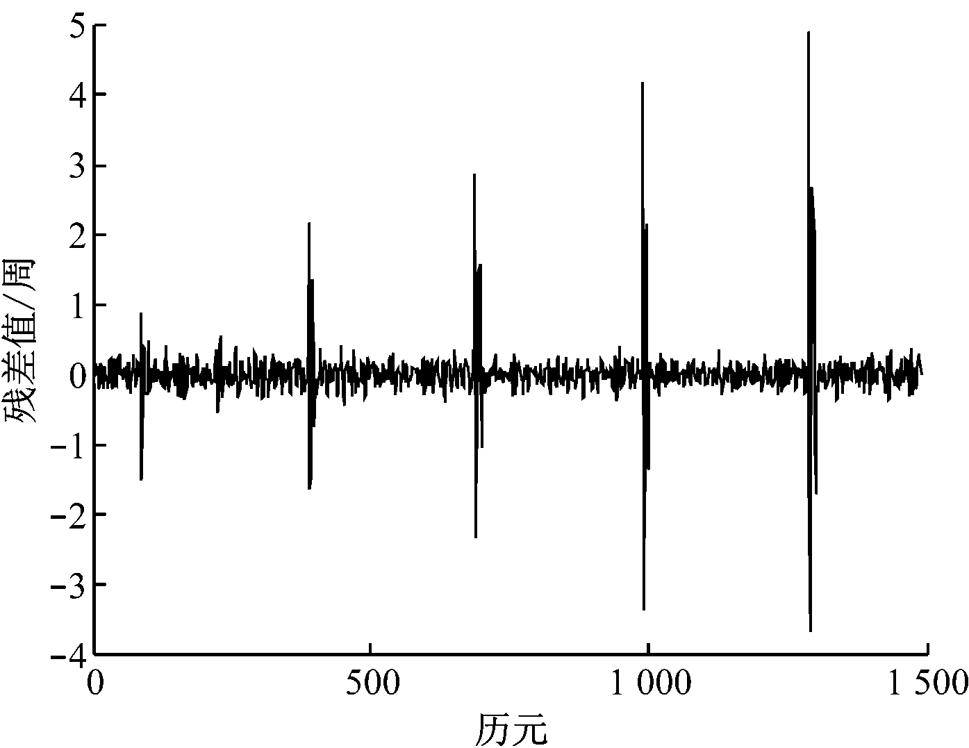 为了启动Kalman滤波程序,必须要有一个初始值 X0和 P0,它一般可由前N 点通过三阶多项式平滑取得,本文取N=12,但N并不是一个固定数值,N的选取应视观测数据质量情况而定,若N值选取不当,容易造成滤波发散,不能很好地探测周跳。