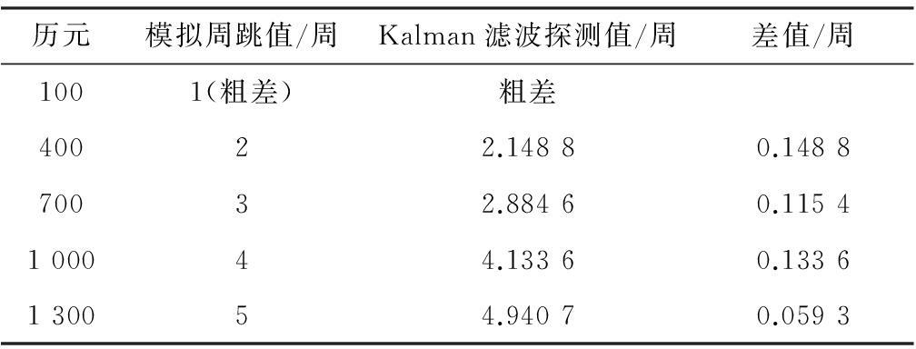 实验2在上述一组干净数据中第100历元处加入大小为1的粗差,在第400,700,1 000,1 300历元处加入大小为2,3,4,5周的周跳后,分别利用多项式拟合法、Kalman滤波法进行周跳探测,结果如图3及表1所示。