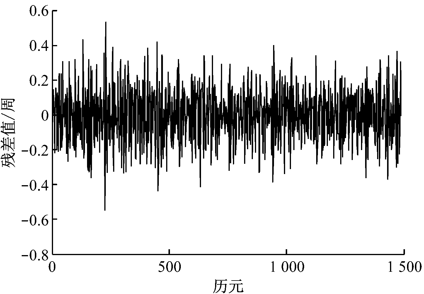 从图2可以看出,对于采样间隔为1 s的北斗单频实测数据,多项式拟合法和Kalman 滤波法探测出的无周跳噪声水平相差不多,相比之下Kalman滤波的效果要好一些。在实际观测时,受接收机所处环境的影响,使得原始数据含有较大观测噪声,Kalman滤波预报残差序列在[-0.497,0.461]周范围内波动,在一定程度上会影响该方法探测周跳的精度。