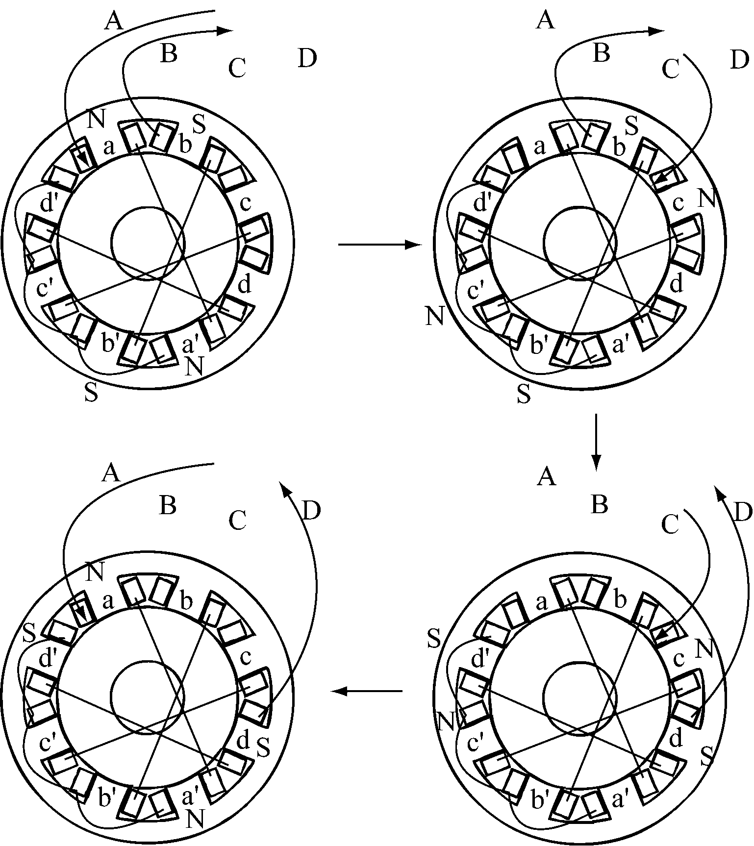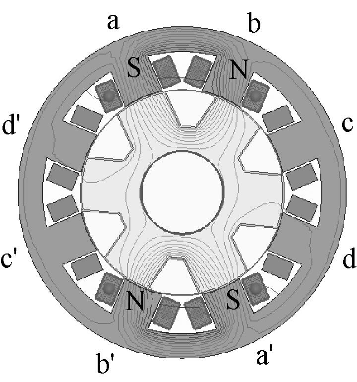 (4) 四相反向绕组、各相独立连接模式。四相反向绕组与三相反向绕组类似,由于多了一相,可以通过合适的电流流向实现定子磁极的规则分布。按照aa′,b′b,cc′,d′d的电流流向,可构成NSNSNSNS磁极分布,如图5所示,极间磁极为NS,极间互感较强,转矩脉动较小,平均转矩较大。