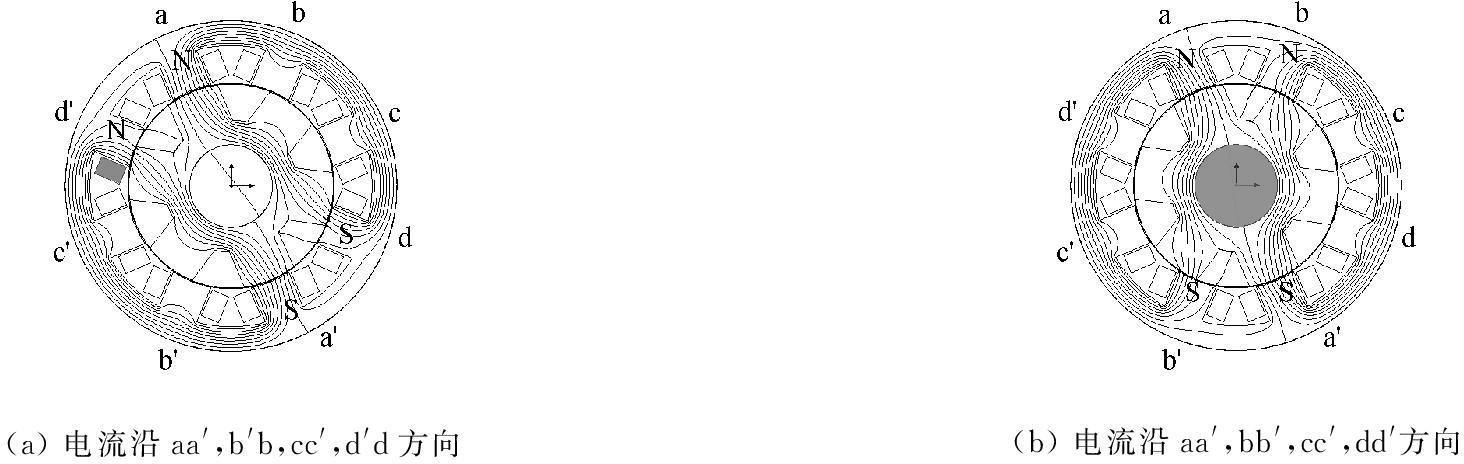 (3) 四相正向绕组、各相独立连接模式。参考三相正向绕组、各相独立连接模式的电流流向设定规则,设定四相正向绕组、各相独立连接模式的2种电流流向:① 电流沿aa′,b′b,cc′,d′d方向,可构成NSNSSNSN磁极分布,如图4(a)所示,极间磁极分布不一致,转矩脉动较大;② 电流沿aa′,bb′,cc′,dd′方向,可构成NNNNSSSS磁极分布,如图4(b)所示,极间磁极分布不一致,转矩脉动较大。