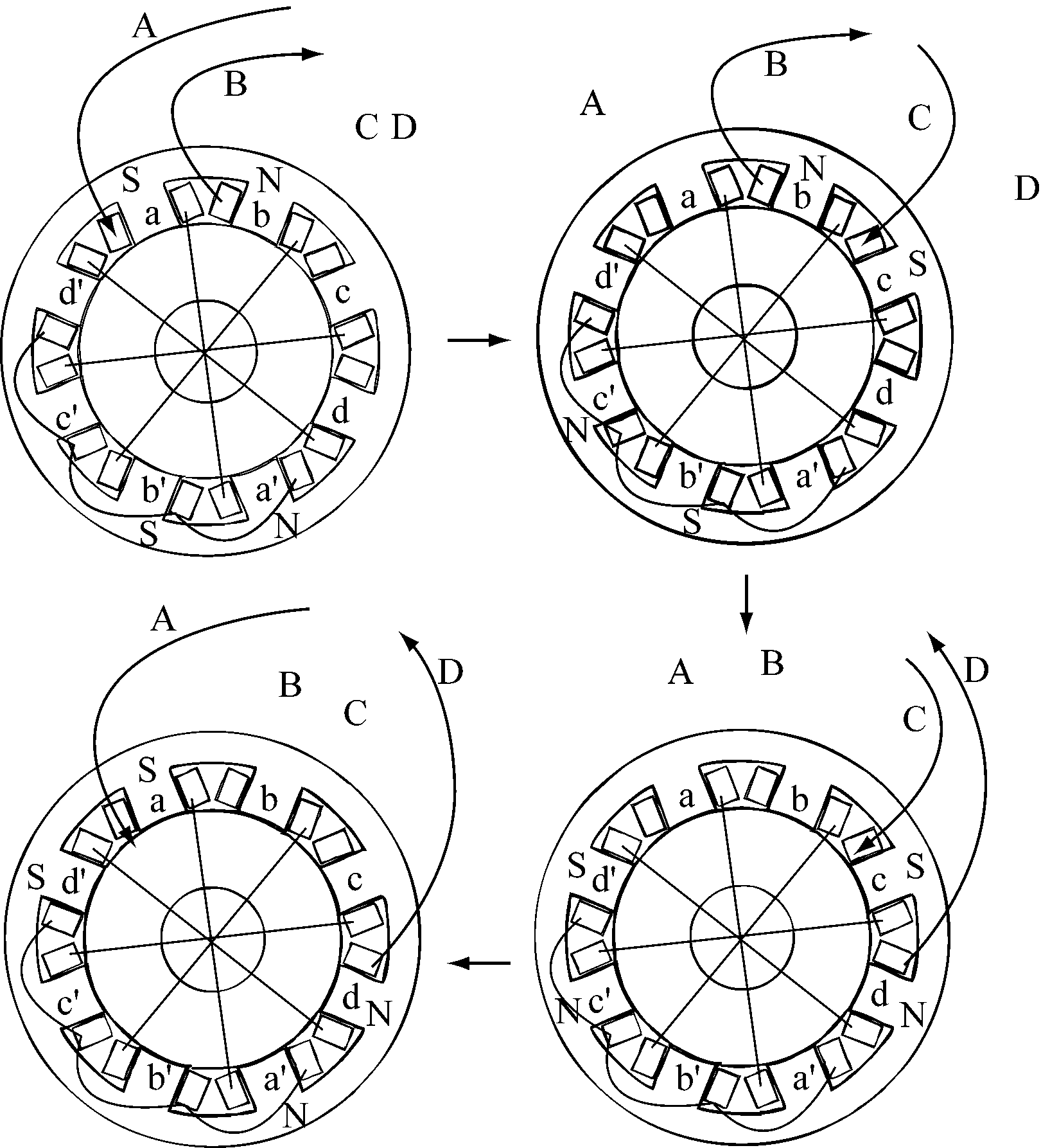 图5 四相反向绕组、各相独立连接模式的磁极分布