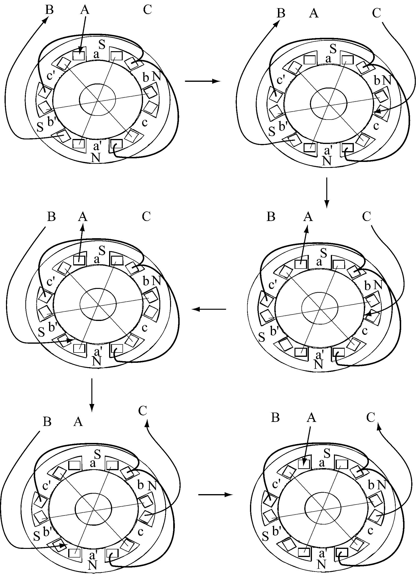 图3 三相反向绕组、各相独立连接模式的磁极分布