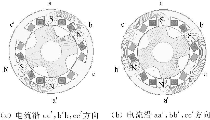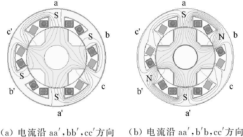 (2) 三相反向绕组、各相独立连接模式。在各相独立连接情况下,TPE的电流流向对SRM磁场影响极大,本文设定2种电流流向:① 电流沿aa′,bb′,cc′方向,可构成SSSSSS磁极分布,如图3(a)所示,极间互感较弱,平均转矩小;② 电流沿aa′,b′b,cc′方向,可构成NSNSNS磁极分布,如图3(b)所示,极间磁极分布一致,互感较强,转矩脉动抑制较好,平均转矩较大。